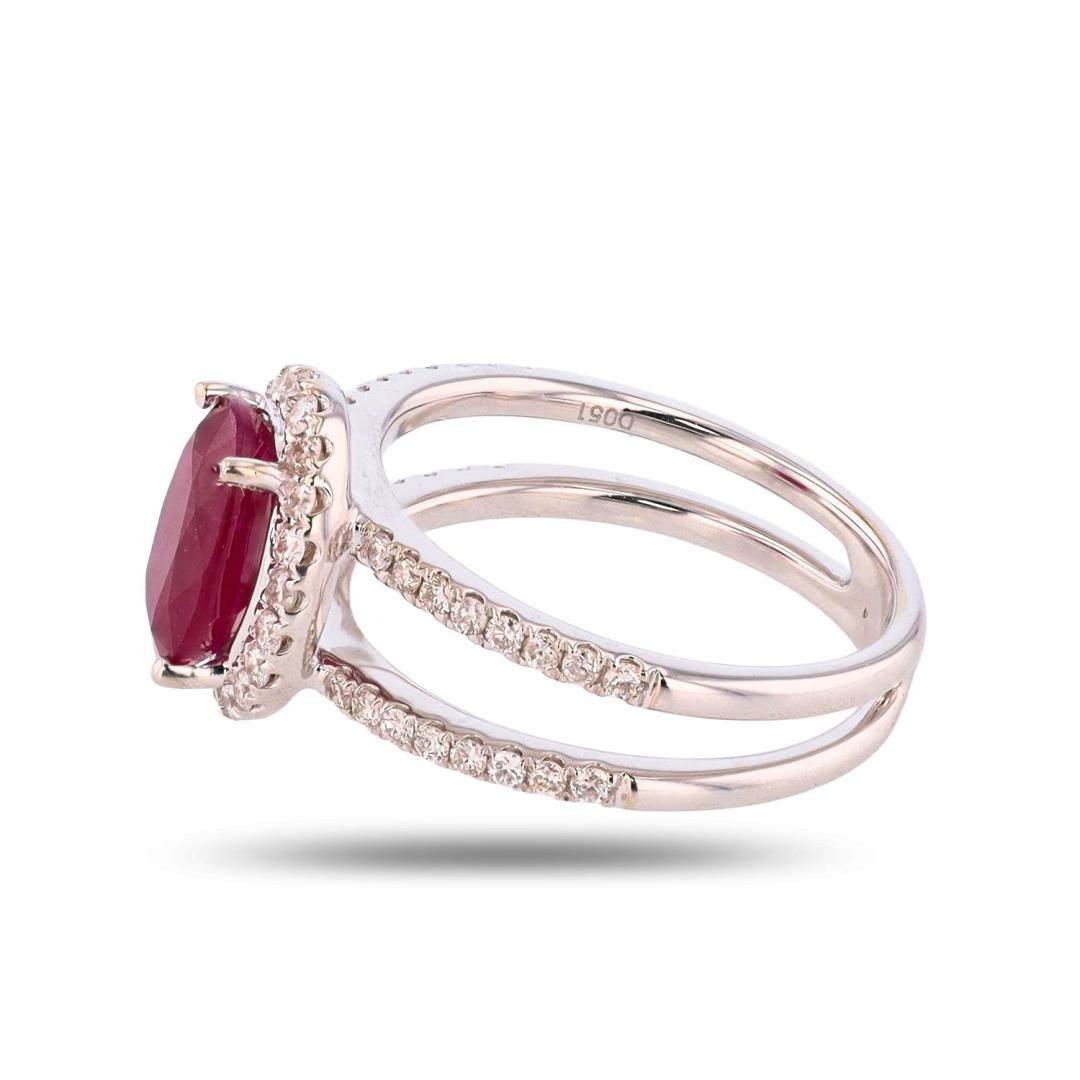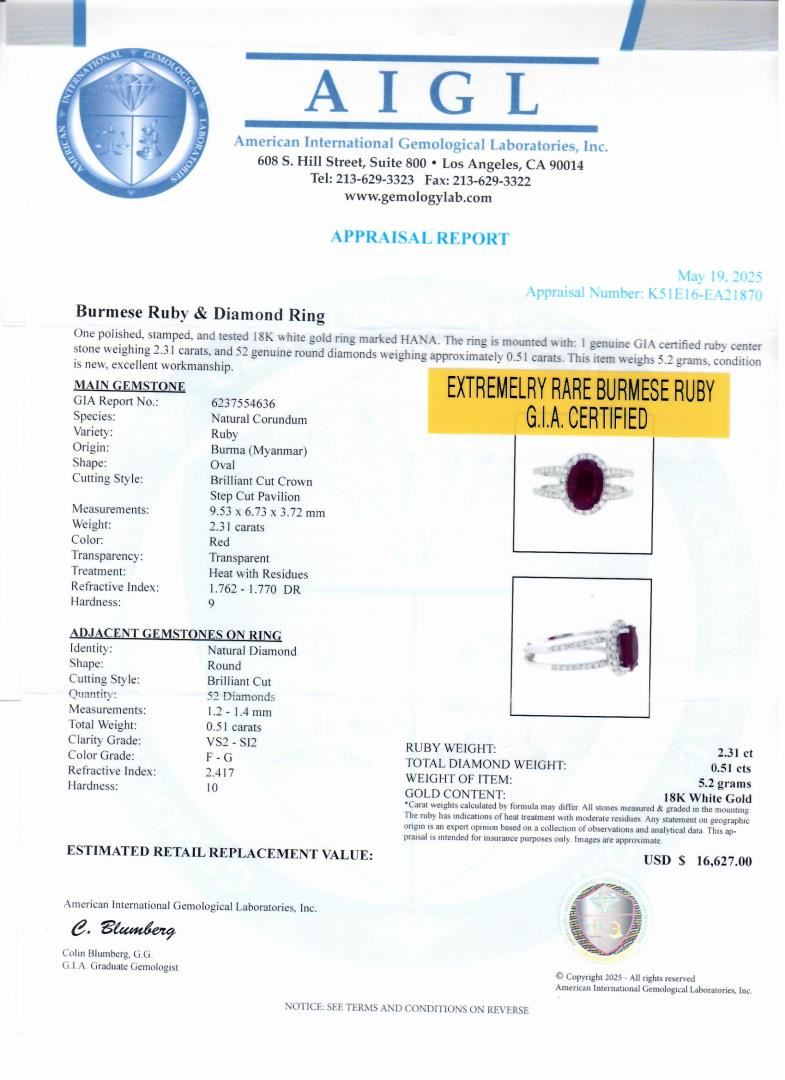 One polished, stamped, and tested 18K white gold ring marked HANA. The ring is mounted with: 1 genuine GIA certified ruby center stone weighing 2.31 carats, and 52 genuine round diamonds weighing approximately 0.51 carats. This item weighs 5.2 grams, condition is new, excellent workmanship. #MAIN GEMSTONE# GIA Report No.: 6237554636; Species: Natural Corundum; Variety: Ruby; Origin: Burma (Myanmar); Shape: Oval; Cutting Style: Brilliant Cut Crown, Step Cut Pavilion; Measurements: 9.53 x 6.73 x 3.72mm; Weight: 2.31 carats; Color: Red; Transparency: Transparent; Treatment: Heat with Residues; Refractive Index: 1.762 - 1.770 DR; Hardness: 9 #ADJACENT GEMSTONES ON RING# Identity: Natural Diamond; Shape: Round; Cutting Style: Brilliant Cut; Quantity: 52 Diamonds; Measurements: 1.2 - 1.4mm; Total Weight: 0.51 carats; Clarity Grade: VS2-SI2; Color Grade: F-G; Refractive Index: 2.417; Hardness: 10 #RUBY WEIGHT: 2.31 ct; TOTAL DIAMOND WEIGHT: 0.51 cts; WEIGHT OF ITEM: 5.2 grams; GOLD CONTENT: 18K White Gold #Size: 7