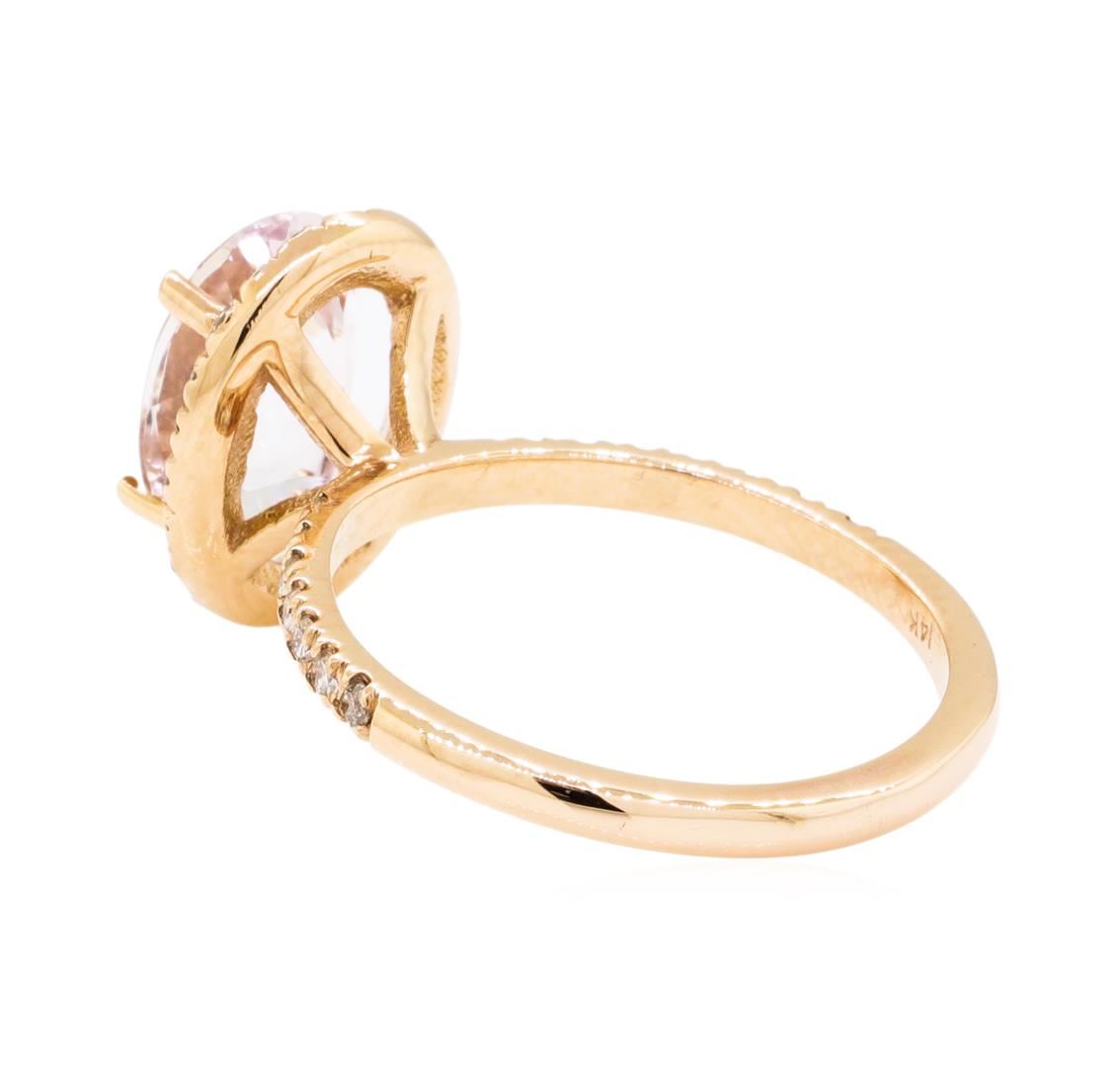 One lady's ring featuring: 14KT rose gold weighing 3.1 grams containing one morganite weighing 2.31ct and diamonds weighing 0.39ctw.