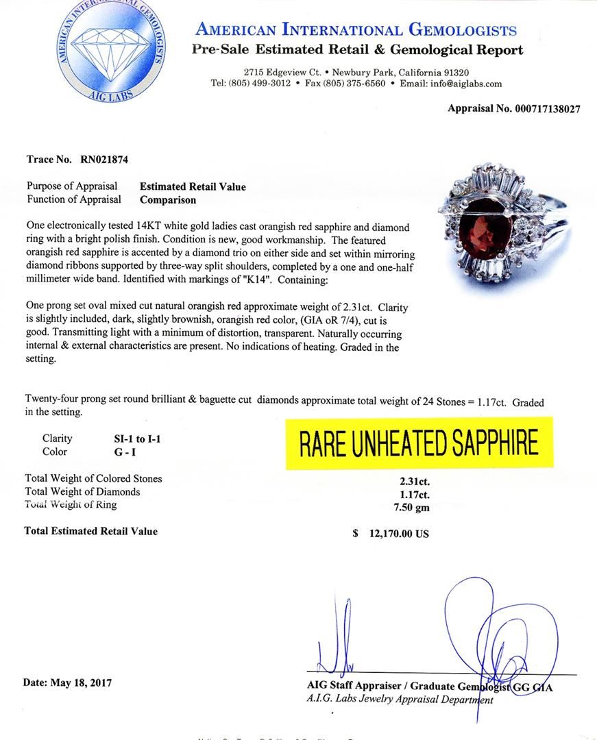 2.31ct RARE Unheated Sapphire and 1.17ctw Diamond 14K White Gold Ring. Please see Photos and Description for all available information. The ring is size 6 1/2. The large stone is a 2.31ct RARE Unheated Sapphire and the small stones are 1.17ctw Diamonds. It is set in 14K White Gold.