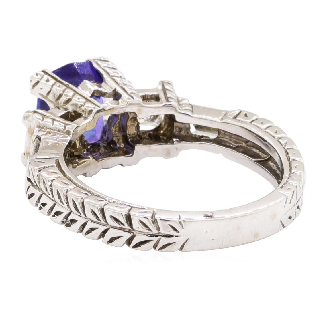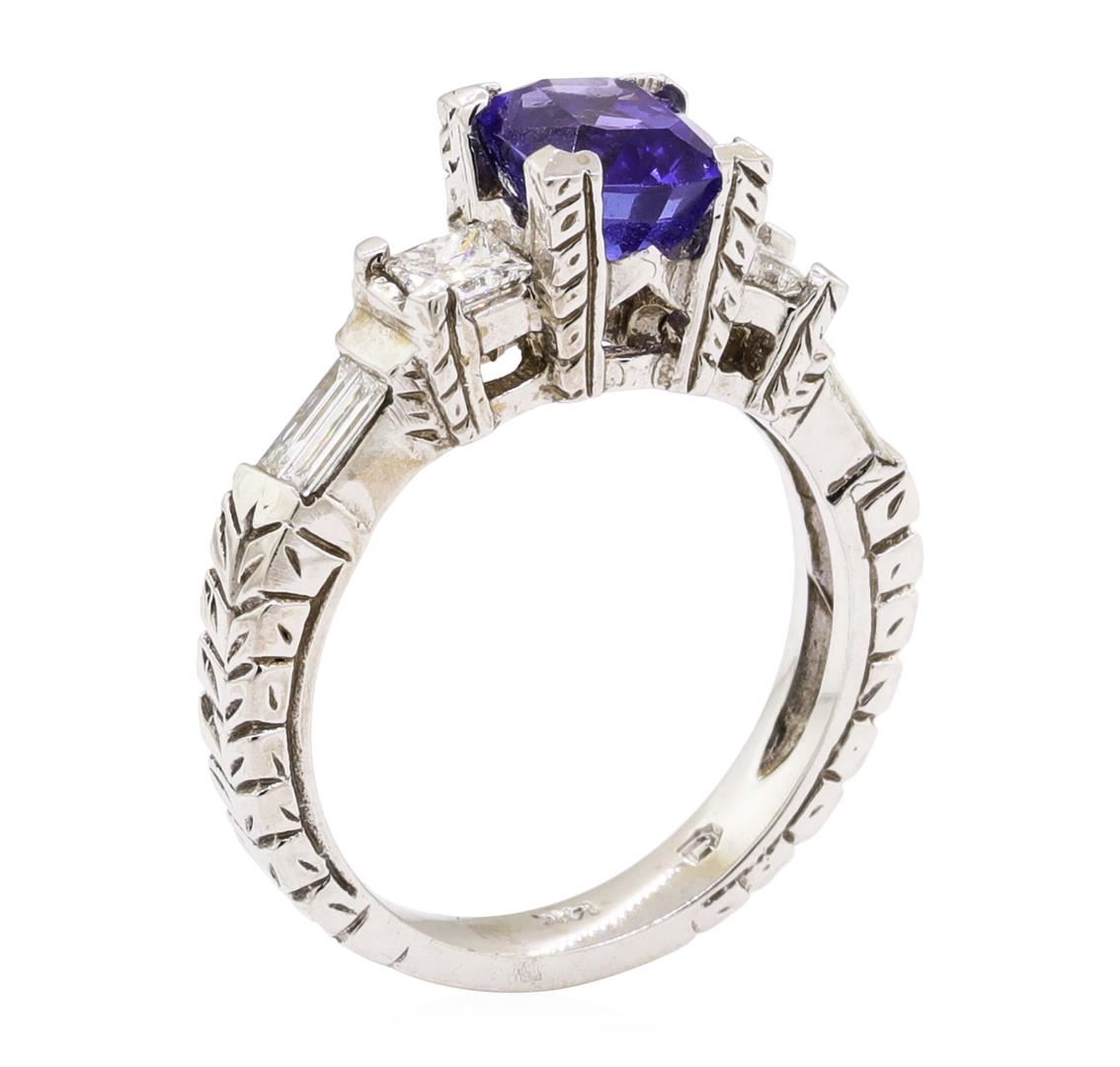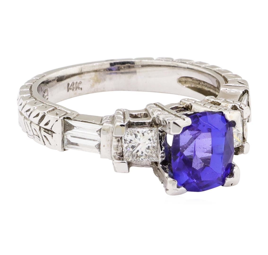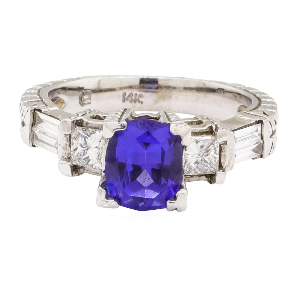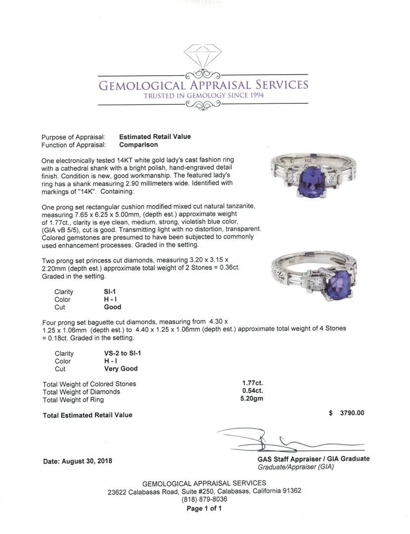 One electronically tested 14KT white gold lady's cast fashion ring with a cathedral shank with a bright polish, hand-engraved detail finish. The featured lady's ring has a shank measuring 2.90 millimeters wide. Identified with markings of '14K'. Condition is new, good workmanship. Containing: One prong set rectangular cushion modified mixed cut natural tanzanite, measuring 7.65 x 6.25 x 5.00mm, (depth est.) approximate weight of 1.77ct., clarity is eye clean, medium, strong, violetish blue color, (GIA vB 5/5), cut is good. Transmitting light with no distortion, transparent. Colored gemstones are presumed to have been subjected to commonly used enhancement processes. Graded in the setting. Two prong set princess cut diamonds, measuring 3.20 x 3.15 x 2.20mm (depth est.) approximate total weight of 2 Stones = 0.36ct. Graded in the setting. Color H - I Clarity SI-1 Cut Good Four prong set baguette cut diamonds, measuring from 4.30 x 1.25 x 1.06mm (depth est.) to 4.40 x 1.25 x 1.06mm (depth est.) approximate total weight of 4 Stones = 0.18ct. Graded in the setting. Color H - I Clarity VS-2 to SI-1 Cut Very Good. Total Weight of Colored Stones 1.77ct.. Total Weight of Diamonds 0.54ct.. Total Weight of Ring 5.20gm GAS Appraised at $3790.00. GAS Appraised at $3,790.00.