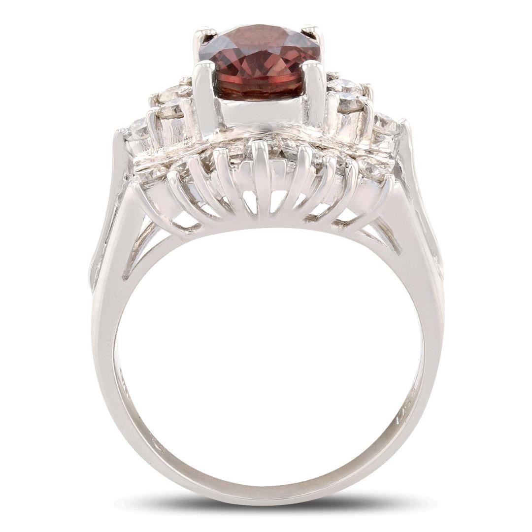 One electronically tested 14KT white gold ladies cast orangish red sapphire and diamond ring with a bright polish finish. Condition is new, good workmanship. The featured orangish red sapphire is accented by a diamond trio on either side and set within mirroring diamond ribbons supported by three-way split shoulders, completed by a one and one-half millimeter wide band. Identified with markings of "K14". Containing: One prong set oval mixed cut natural orangish red approximate weight of 2.31et. Clarity is slightly included, dark, slightly brownish, orangish red color, (GIA oR 7/4), cut is good. Transmitting light with a minimum of distortion, transparent. Naturally occurring internal & external characteristics are present. No indications of heating. Graded in the setting. Twenty-four prong set round brilliant & baguette cut diamonds approximate total weight of 24 Stones = 1.17ct. Graded in the setting. Clarity SI-1 to I-1 Color G - I Total Weight of Colored Stones 2.31 ct. Total Weight of Diamonds 1.17ct. Total Weight of Ring 7.50 gm