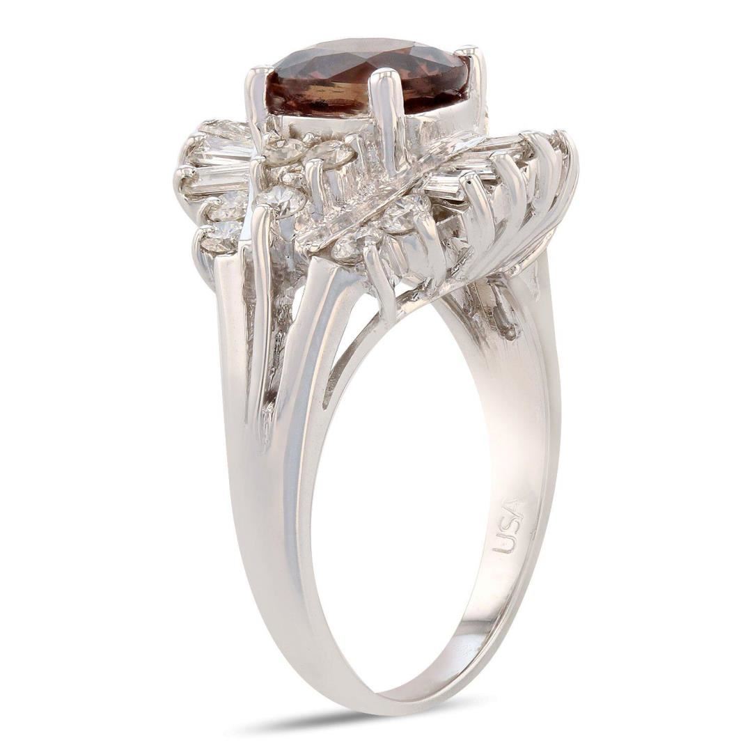 One electronically tested 14KT white gold ladies cast orangish red sapphire and diamond ring with a bright polish finish. Condition is new, good workmanship. The featured orangish red sapphire is accented by a diamond trio on either side and set within mirroring diamond ribbons supported by three-way split shoulders, completed by a one and one-half millimeter wide band. Identified with markings of "K14". Containing: One prong set oval mixed cut natural orangish red approximate weight of 2.31et. Clarity is slightly included, dark, slightly brownish, orangish red color, (GIA oR 7/4), cut is good. Transmitting light with a minimum of distortion, transparent. Naturally occurring internal & external characteristics are present. No indications of heating. Graded in the setting. Twenty-four prong set round brilliant & baguette cut diamonds approximate total weight of 24 Stones = 1.17ct. Graded in the setting. Clarity SI-1 to I-1 Color G - I Total Weight of Colored Stones 2.31 ct. Total Weight of Diamonds 1.17ct. Total Weight of Ring 7.50 gm #LREF-4723