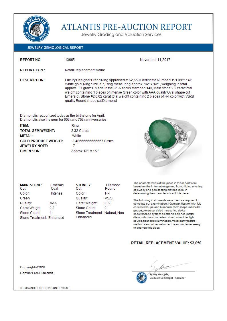 REF-40T2M -13665 ---- 2.32 CTW Emerald & Diamond Ring 14K White Gold ---- Luxury Designer Brand Ring Appraised at $2,650 Certificate Number US13665 14k White gold, Ring Size is 7, Ring measuring approx. 1/2" x 1/2" , weighing in total approx. 3.1 grams. Made in the USA and is stamped 14k, Main stone 2.3 carat total weight containing 1 pieces of Intense Green color with AAA quality Oval shape cut Emerald , Stone #2 0.02 carat total weight containing 2 pieces of H-I color with VS/SI quality Round shape cut Diamond