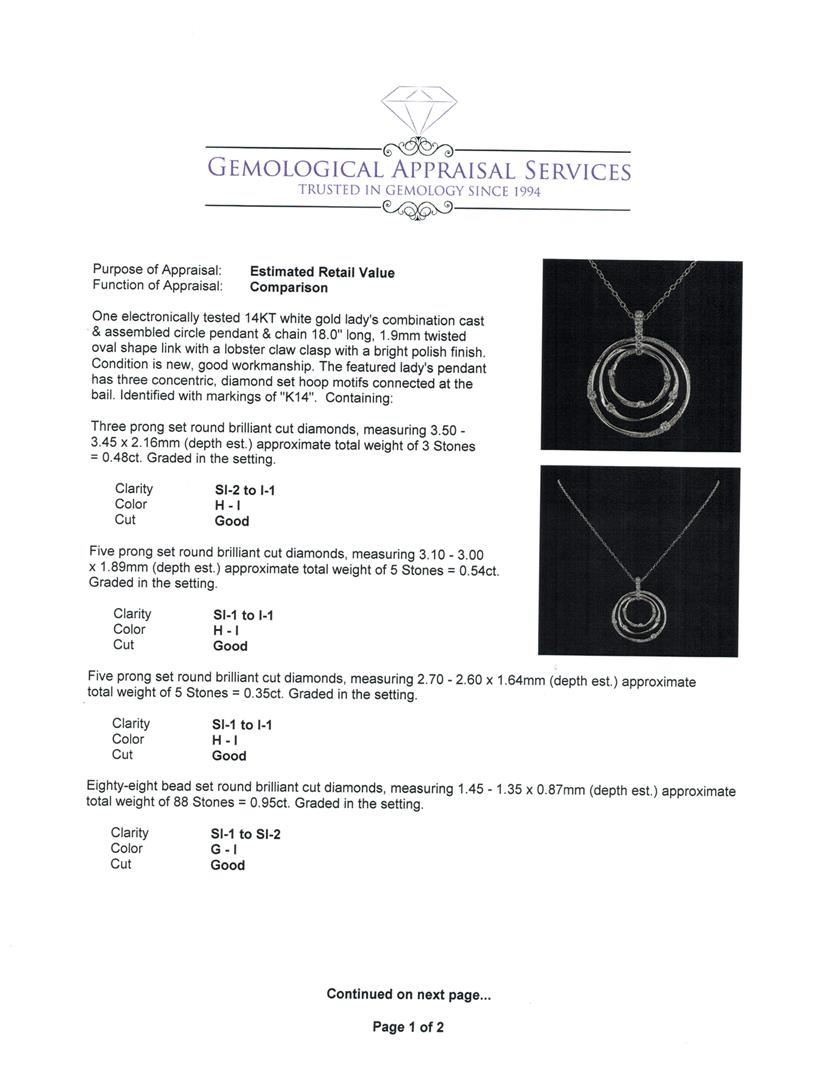 One electronically tested 14KT white gold lady's combination cast & assembled circle pendant & chain 18.0' long, 1.9mm twisted oval shape link with a lobster claw clasp with a bright polish finish. The featured lady's pendant has three concentric, diamond set hoop motifs connected at the bail. Identified with markings of 'K14'. Condition is new, good workmanship. Containing: Three prong set round brilliant cut diamonds, measuring 3.50 - 3.45 x 2.16mm (depth est.) approximate total weight of 3 Stones = 0.48ct. Graded in the setting. Clarity SI-2 to I-1. Color: H - I Cut Good Five prong set round brilliant cut diamonds, measuring 3.10 - 3.00 x 1.89mm (depth est.) approximate total weight of 5 Stones = 0.54ct. Graded in the setting. Clarity SI-1 to I-1. Color: H - I Cut Good Five prong set round brilliant cut diamonds, measuring 2.70 - 2.60 x 1.64mm (depth est.) approximate total weight of 5 Stones = 0.35ct. Graded in the setting. Clarity SI-1 to I-1. Color: H - I Cut Good Eighty-Eight bead set round brilliant cut diamonds, measuring 1.45 - 1.35 x 0.87mm (depth est.) approximate total weight of 88 Stones = 0.95ct. Graded in the setting. Clarity SI-1 to SI-2. Color: G - I Cut Good. Total Weight of Diamonds 2.32ct.. Total Weight of Pendant & Chain 12.10gm. GAS Appraised at $7,645.00.