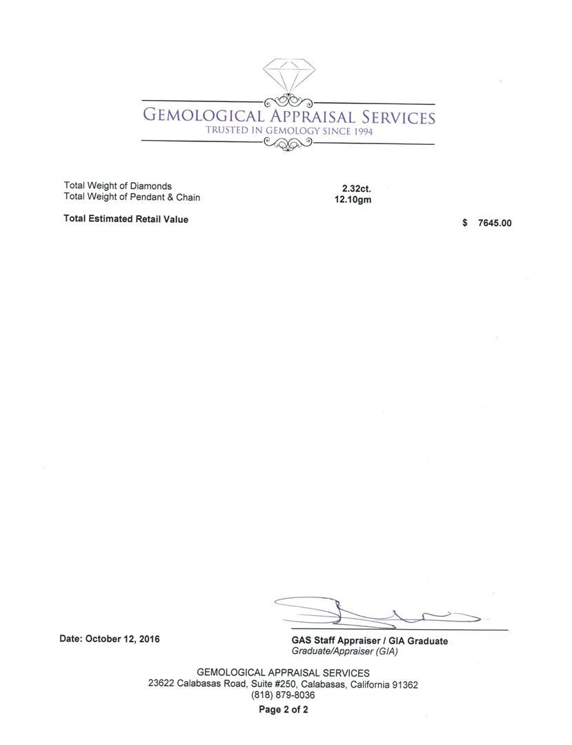 One electronically tested 14KT white gold lady's combination cast & assembled circle pendant & chain 18.0' long, 1.9mm twisted oval shape link with a lobster claw clasp with a bright polish finish. The featured lady's pendant has three concentric, diamond set hoop motifs connected at the bail. Identified with markings of 'K14'. Condition is new, good workmanship. Containing: Three prong set round brilliant cut diamonds, measuring 3.50 - 3.45 x 2.16mm (depth est.) approximate total weight of 3 Stones = 0.48ct. Graded in the setting. Clarity SI-2 to I-1. Color: H - I Cut Good Five prong set round brilliant cut diamonds, measuring 3.10 - 3.00 x 1.89mm (depth est.) approximate total weight of 5 Stones = 0.54ct. Graded in the setting. Clarity SI-1 to I-1. Color: H - I Cut Good Five prong set round brilliant cut diamonds, measuring 2.70 - 2.60 x 1.64mm (depth est.) approximate total weight of 5 Stones = 0.35ct. Graded in the setting. Clarity SI-1 to I-1. Color: H - I Cut Good Eighty-Eight bead set round brilliant cut diamonds, measuring 1.45 - 1.35 x 0.87mm (depth est.) approximate total weight of 88 Stones = 0.95ct. Graded in the setting. Clarity SI-1 to SI-2. Color: G - I Cut Good. Total Weight of Diamonds 2.32ct.. Total Weight of Pendant & Chain 12.10gm. GAS Appraised at $7,645.00.