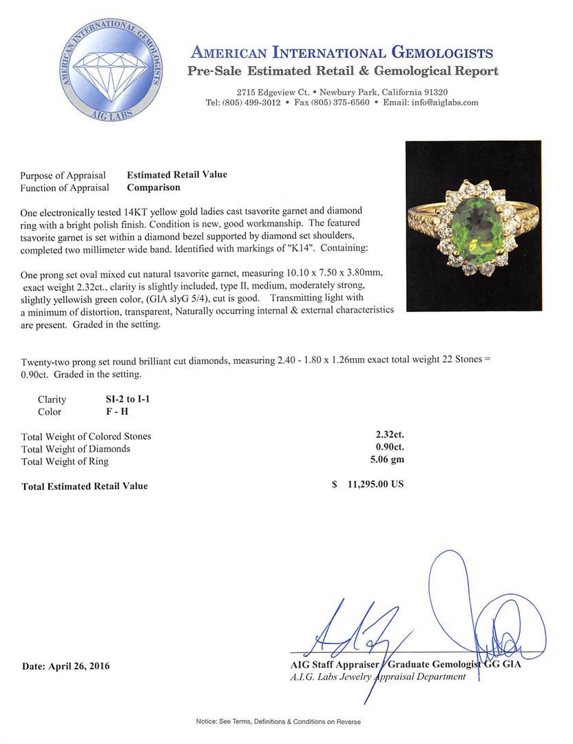 One electronically tested 14KT yellow gold ladies cast tsavorite garnet and diamond ring with a bright polish finish. The featured tsavorite garnet is set within a diamond bezel supported by diamond set shoulders, completed two millimeter wide band. Identified with markings of "K14". Condition is new, good workmanship. Containing: One prong set oval mixed cut natural tsavorite garnet, measuring 10.10 x 7.50 x 3.80mm, exact weight 2.32ct., clarity is slightly included, type II, medium, moderately strong, slightly yellowish green color, (GIA slyG 5/4), cut is good. Transmitting light with a minimum of distortion, transparent, Naturally occurring internal & external characteristics are present. Graded in the setting. Twenty-Two prong set round brilliant cut diamonds, measuring 2.40 - 1.80 x 1.26mm exact total weight 22 Stones = 0.90ct. Graded in the setting. Clarity: SI-2 to I-1. Color: F - H. Total Weight of Colored Stones 2.32ct. Total Weight of Diamonds 0.90ct. Total Weight of Ring 5.06gm. AIG Appraised at $11,295.00.