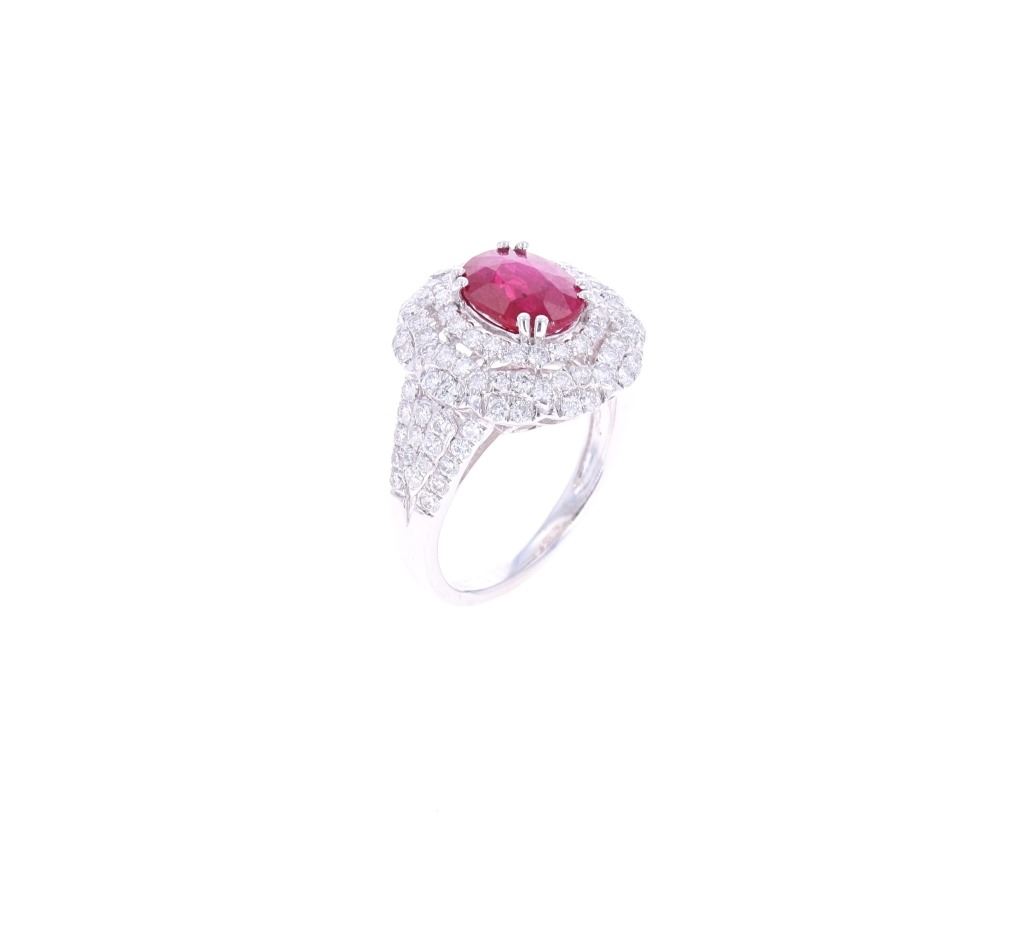 Featured in this lot is this 2.32ct ruby and VS1 diamond PT950 platinum ring with AIGL paperwork. The ring features a polished, stamped, and tested platinum construction that shows a heavily decorated ring face that is marked on the inside of the ring band as follows: Orianne - PT950. The center stone is a oval cut brilliant ruby gemstone that measures 9.2 x 7mm and shows a red coloration with a very good cut grade and shows a total weight of 2.32cts. The ring shows a total of 104 round brilliant diamonds with measurements of 1.1 - 1.8mm that shows clarity of VS1 - SI1 and a coloration of F - G and a total diamond weight of 1.37cts. The ring size is US 7 1/2. The piece comes complete with AIGL Inc.(American International Gemological Laboratories, Inc. a GIA certified lab AIGL#: K62E28-EA15279) report and appraisal confirming the above info and giving a total value of $15,570.00.