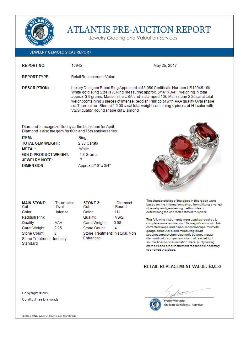 2.33 CTW Pink Tourmaline & Diamond Ring 10K White Gold ---- Luxury Designer Brand Ring Appraised Retail Price at $3,050 ---- SKU Number US10945 10k White gold Ring Size is 7, Ring measuring approx. 5/16" x 3/4" , weighing in total approx. 3.9 grams. Made in the USA and is stamped 10k, Main stone 2.25 carat total weight containing 3 pieces of Intense Reddish Pink color with AAA quality Oval shape cut Tourmaline , Stone #2 0.08 carat total weight containing 4 pieces of H-I color with VS/SI quality Round shape cut