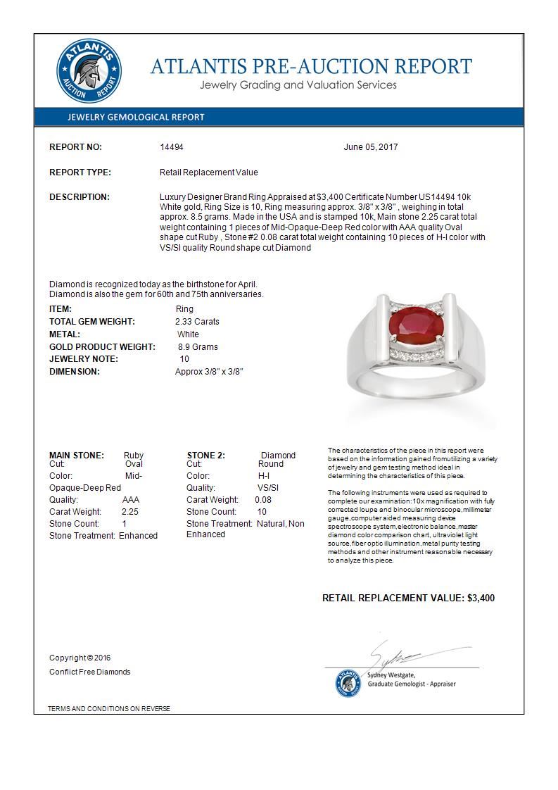 2.33 CTW Ruby & Diamond Mens Ring 10K White Gold ---- Luxury Designer Brand Ring Appraised Retail Price at $3,400 ---- SKU Number US14494 10k White gold Ring Size is 10, Ring measuring approx. 3/8" x 3/8" , weighing in total approx. 8.5 grams. Made in the USA and is stamped 10k, Main stone 2.25 carat total weight containing 1 pieces of Mid-Opaque-Deep Red color with AAA quality Oval shape cut Ruby , Stone #2 0.08 carat total weight containing 10 pieces of H-I color with VS/SI quality Round shape cut