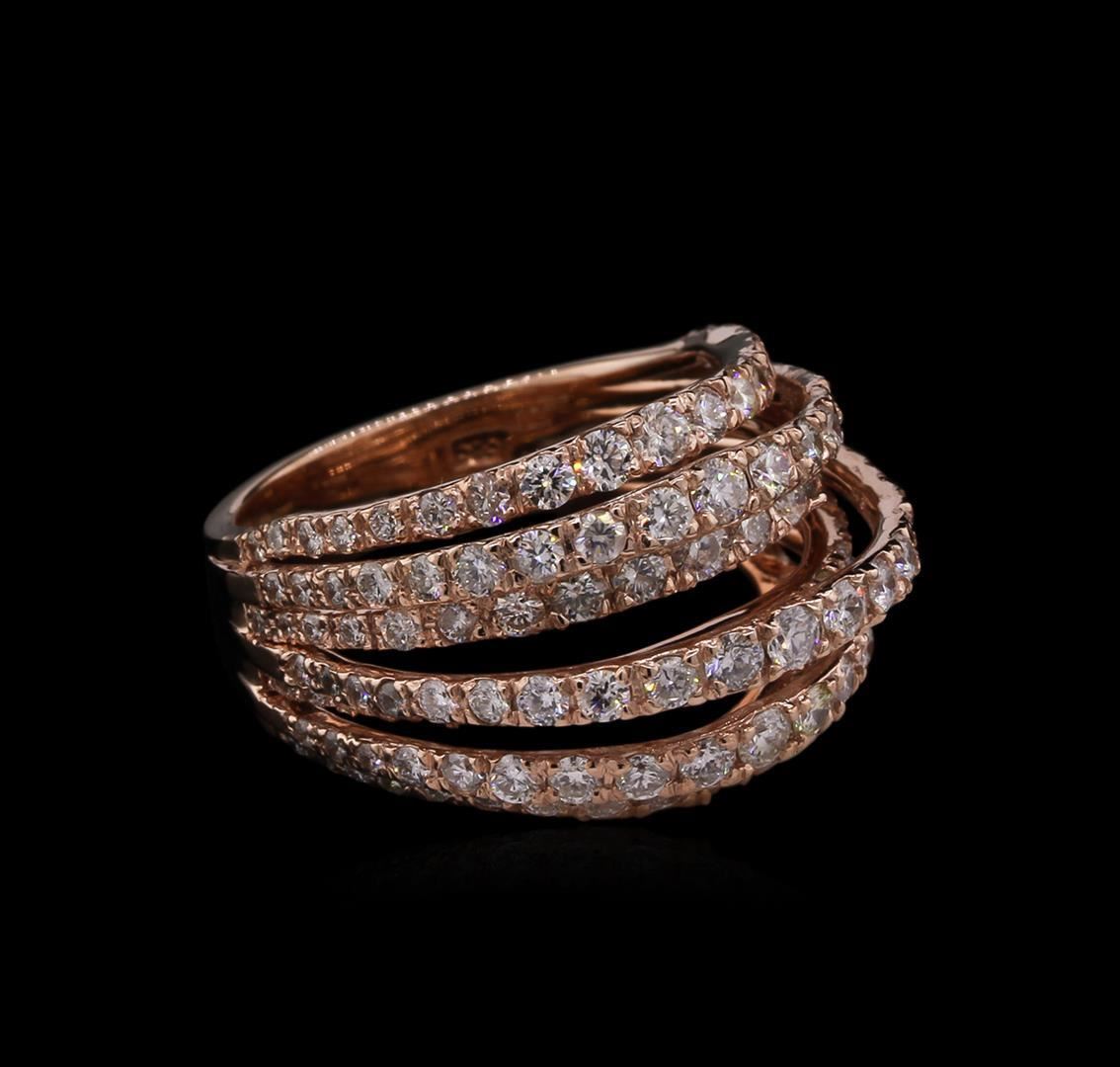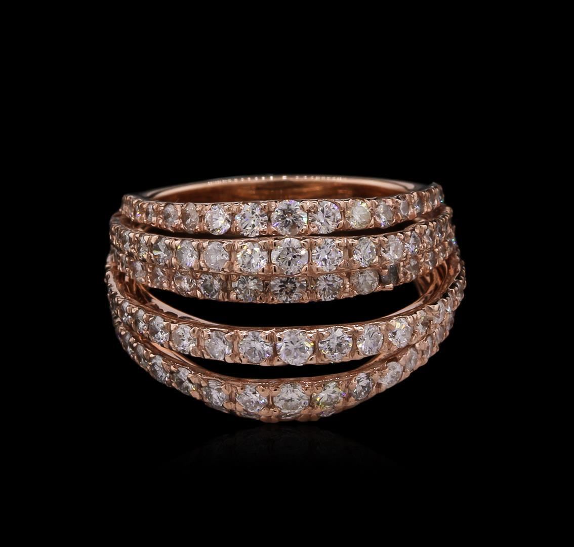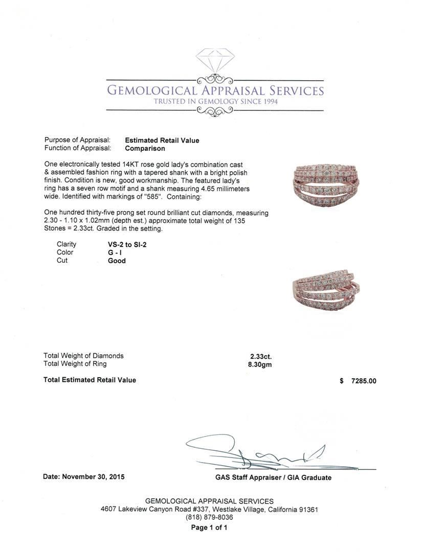 One electronically tested 14KT rose gold lady's combination cast & assembled fashion ring with a tapered shank with a bright polish finish. The featured lady's ring has a seven row motif and a shank measuring 4.65 millimeters wide. Identified with markings of "585". Condition is new, good workmanship. Containing: One Hundred Thirty-Five prong set round brilliant cut diamonds, measuring 2.30 - 1.10 x 1.02mm (depth est.) approximate total weight of 135 Stones = 2.33ct. Graded in the setting. Clarity: VS-2 to SI-2 . Color: G - I. Cut Good. Total Weight of Diamonds 2.33ct.. Total Weight of Ring 8.30gm at $ 7285.00 GAS Appraised.