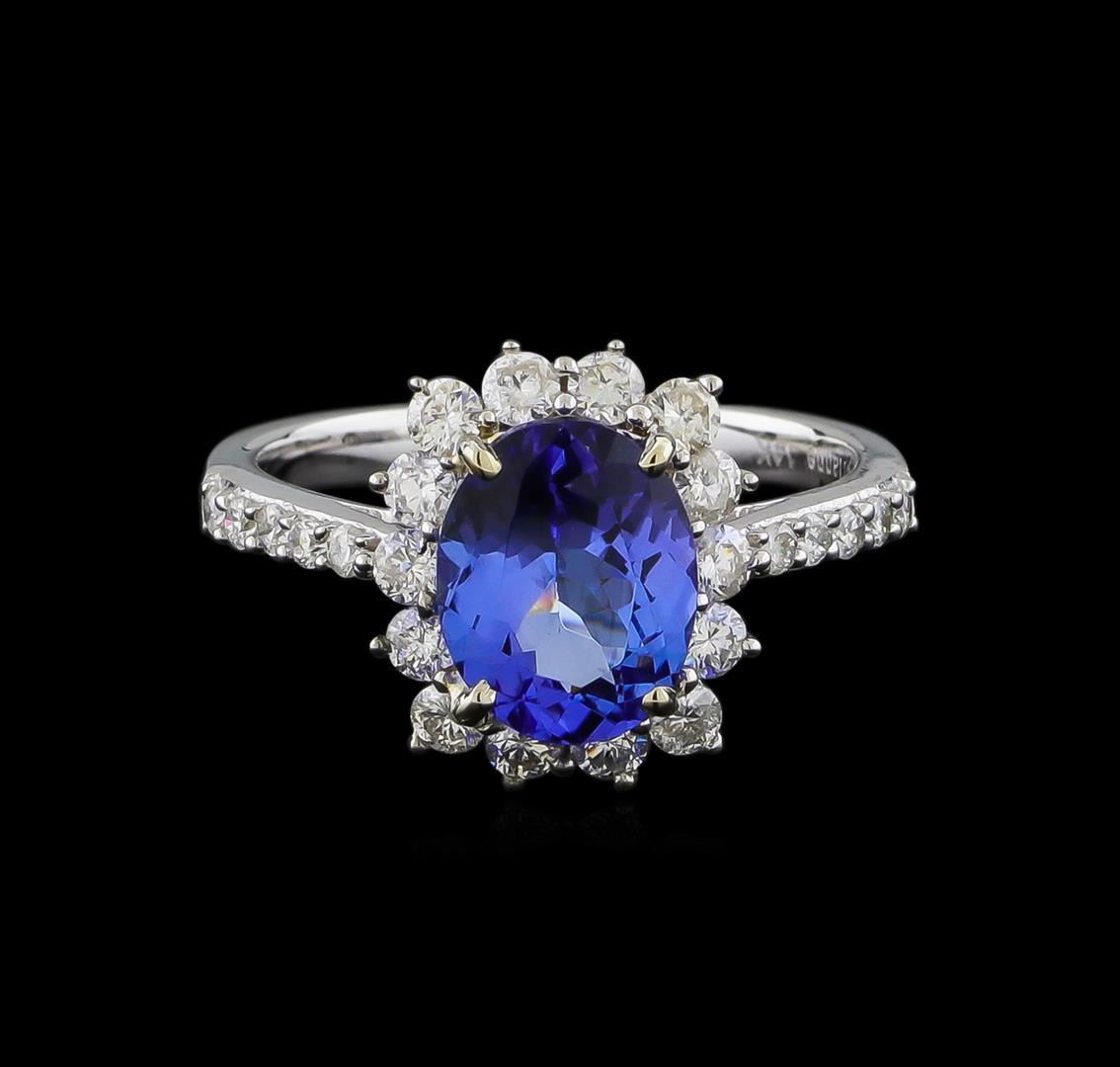 One electronically tested 14KT white gold ladies cast tanzanite and diamond ring with a bright polish finish. The featured tanzanite is set within a diamond floret bezel supported by diamond set shoulders, completed by a two millimeter wide band. Trademark is Orianne. Identified with markings of "14K". Condition is new, good workmanship. Containing: One prong set oval mixed cut natural tanzanite, measuring 9.50 x 7.45 x 4.42mm, 6%. bulge factor, approximate weight of 2.33ct., clarity is eye clean, type I, medium dark, slightly grayish, bluish violet color, (GIA bV 6/2), cut is good. Transmitting light with no distortion, transparent. Graded in the setting. Tanzanite is a very rare gemstone that is only found in the country of Tanzania. Originally discovered in 1967. Tiffany & Company, named the stone Tanzanite. It is found in the Usumburu Mountains that border the Umba Valley of northern Tanzania. Tanzanite occurs in gray, brown, violet, blue, reddish-purple, & green. The gem is interesting because of its exceptional pleochroism. Rotated in different directions a tanzanite will exhibit multiple changes of color. Tanzanite has a low tolerance to ultrasonic cleaning, and should not be cleaned using this method. Fourteen prong set round brilliant cut diamonds, measuring 2.30 - 2.20 x 1.35mm (depth est.) approximate total weight of 14 Stones = 0.68ct. Graded in the setting. Clarity: I-1 to I-2. Color: H - J Ten prong set round brilliant cut diamonds, measuring 1.60 - 1.50 x 0.93mm (depth est.) approximate total weight of 10 Stones = 0.23ct. Graded in the setting. Clarity: I-1 to I-2. Color: G - I. Total Weight of Colored Stones 2.33ct. Total Weight of Diamonds 0.91ct. Total Weight of Ring 3.32gm. AIG Appraised at $6,690.00.