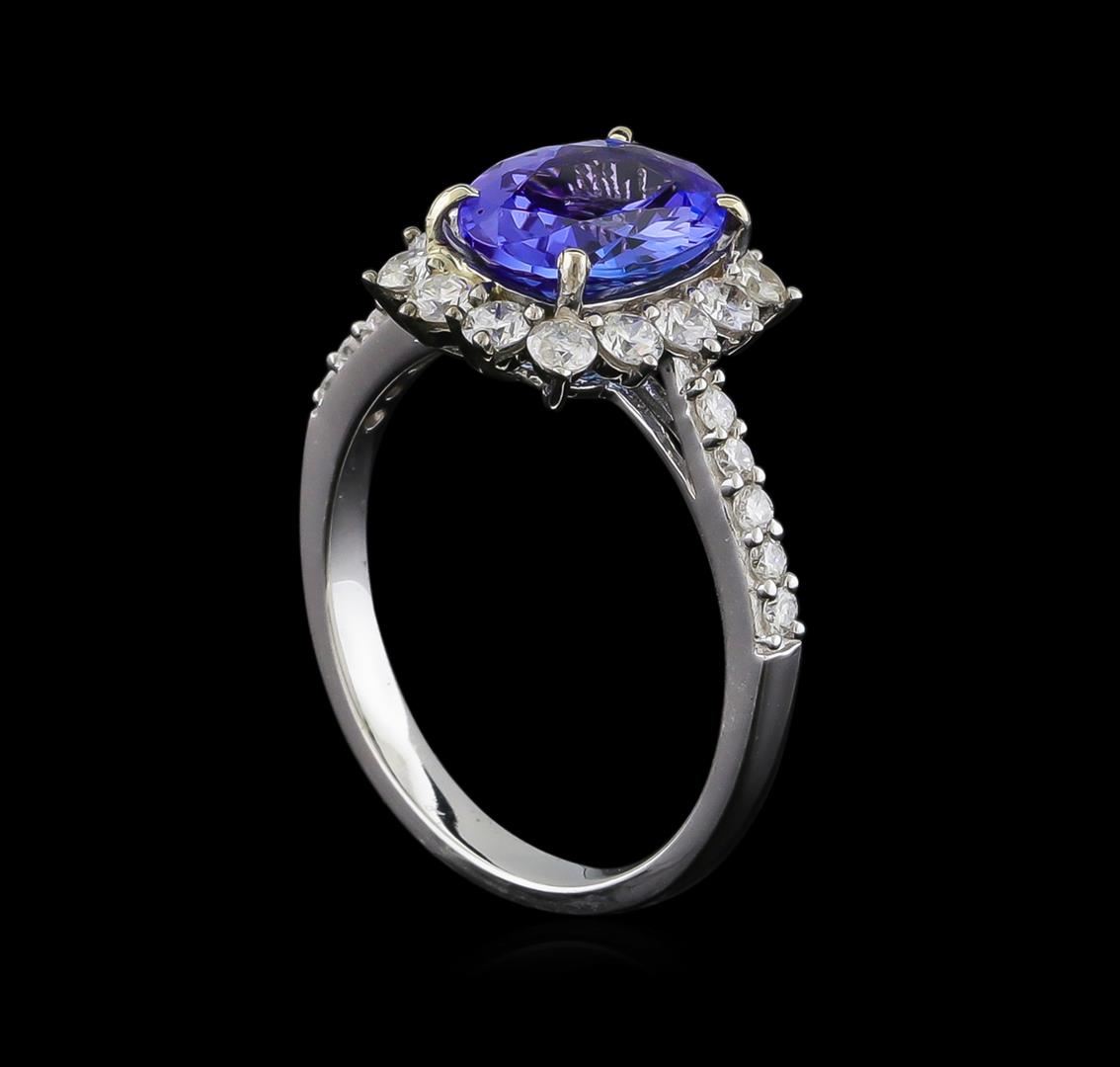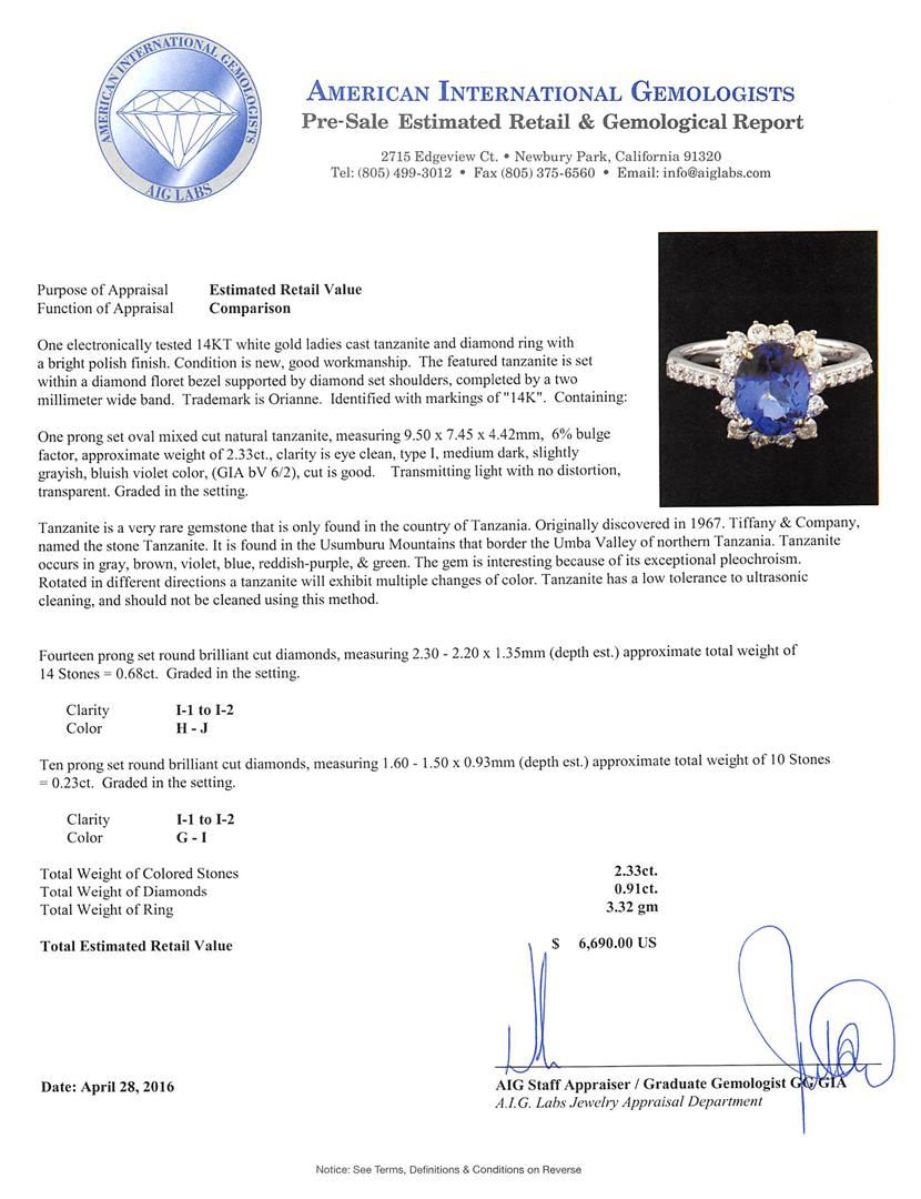One electronically tested 14KT white gold ladies cast tanzanite and diamond ring with a bright polish finish. The featured tanzanite is set within a diamond floret bezel supported by diamond set shoulders, completed by a two millimeter wide band. Trademark is Orianne. Identified with markings of "14K". Condition is new, good workmanship. Containing: One prong set oval mixed cut natural tanzanite, measuring 9.50 x 7.45 x 4.42mm, 6%. bulge factor, approximate weight of 2.33ct., clarity is eye clean, type I, medium dark, slightly grayish, bluish violet color, (GIA bV 6/2), cut is good. Transmitting light with no distortion, transparent. Graded in the setting. Tanzanite is a very rare gemstone that is only found in the country of Tanzania. Originally discovered in 1967. Tiffany & Company, named the stone Tanzanite. It is found in the Usumburu Mountains that border the Umba Valley of northern Tanzania. Tanzanite occurs in gray, brown, violet, blue, reddish-purple, & green. The gem is interesting because of its exceptional pleochroism. Rotated in different directions a tanzanite will exhibit multiple changes of color. Tanzanite has a low tolerance to ultrasonic cleaning, and should not be cleaned using this method. Fourteen prong set round brilliant cut diamonds, measuring 2.30 - 2.20 x 1.35mm (depth est.) approximate total weight of 14 Stones = 0.68ct. Graded in the setting. Clarity: I-1 to I-2. Color: H - J Ten prong set round brilliant cut diamonds, measuring 1.60 - 1.50 x 0.93mm (depth est.) approximate total weight of 10 Stones = 0.23ct. Graded in the setting. Clarity: I-1 to I-2. Color: G - I. Total Weight of Colored Stones 2.33ct. Total Weight of Diamonds 0.91ct. Total Weight of Ring 3.32gm. AIG Appraised at $6,690.00.