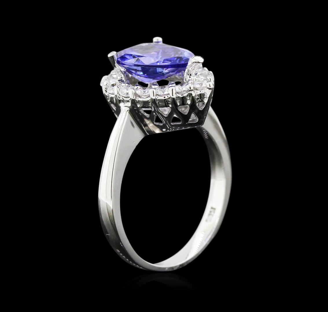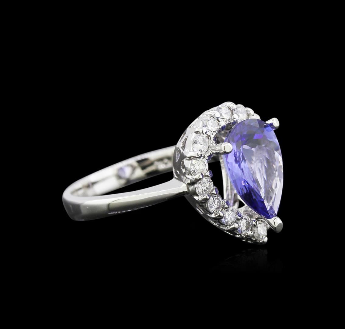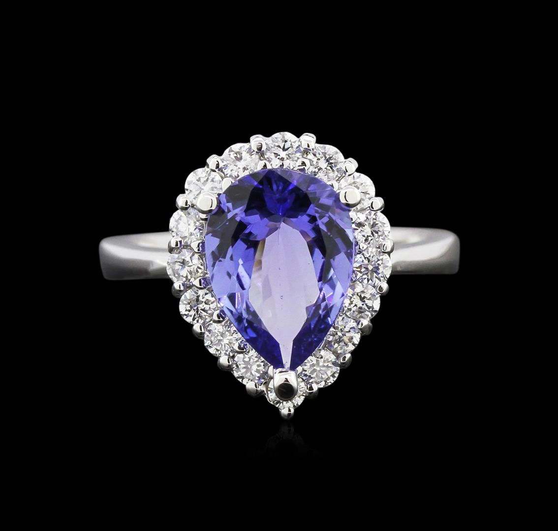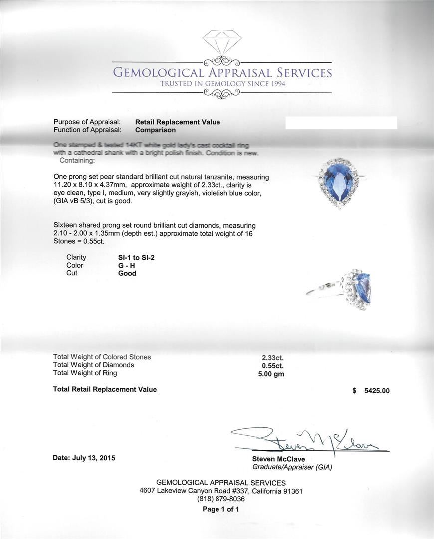 One stamped & tested 14KT white gold lady's cast cocktail ring with a cathedral shank with a bright polish finish. Condition is new. Containing: One prong set pear standard brilliant cut natural tanzanite, measuring 11.20 x 8.10 x 4.37mm, approximate weight of 2.33ct., clarity is eye clean, type I, medium, very slightly grayish, violetish blue color, (GIA vB 5/3), cut is good. Sixteen shared prong set round brilliant cut diamonds, measuring 2.10 - 2.00 x 1.35mm (depth est.) approximate total weight of 16 Stones = 0.55ct. Clarity: SI-1 to SI-2. Color: G - H. Cut: Good. Total Weight of Colored Stones: 2.33ct. Total Weight of Diamonds: 0.55ct. Total Weight of Ring: 5.00 gm. GAS Appraised at $5,425.00.