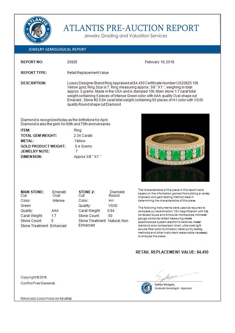 REF-67A3X -20825 ---- 2.34 CTW Emerald & Micro Pave VS/SI Diamond Designer Ring 10K Yellow Gold ---- Luxury Designer Brand Ring Appraised at $4,450 Certificate Number US20825 10k Yellow gold, Ring Size is 7, Ring measuring approx. 3/8 " X1 ", weighing in total approx. 5 grams. Made in the USA and is stamped 10k, Main stone 1.7 carat total weight containing 5 pieces of Intense Green color with AAA quality Oval shape cut Emerald , Stone #2 0.64 carat total weight containing 50 pieces of H-I color with VS/SI quality Round shape cut Diamond
