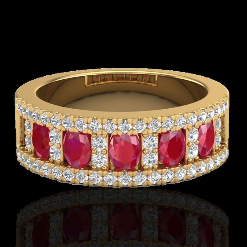 REF-67M3H -20827 ---- 2.34 CTW Ruby & Micro Pave VS/SI Diamond Designer Inspired Ring 10K Yellow Gold ---- Luxury Designer Brand Ring Appraised at $4,800 Certificate Number US20827 10k Yellow gold, Ring Size is 7, Ring measuring approx. 3/8 " X1 ", weighing in total approx. 5 grams. Made in the USA and is stamped 10k, Main stone 1.7 carat total weight containing 5 pieces of Mid-Opaque-Deep Red color with AAA quality Oval shape cut Ruby , Stone #2 0.64 carat total weight containing 50 pieces of H-I color with VS/SI quality Round shape cut Diamond