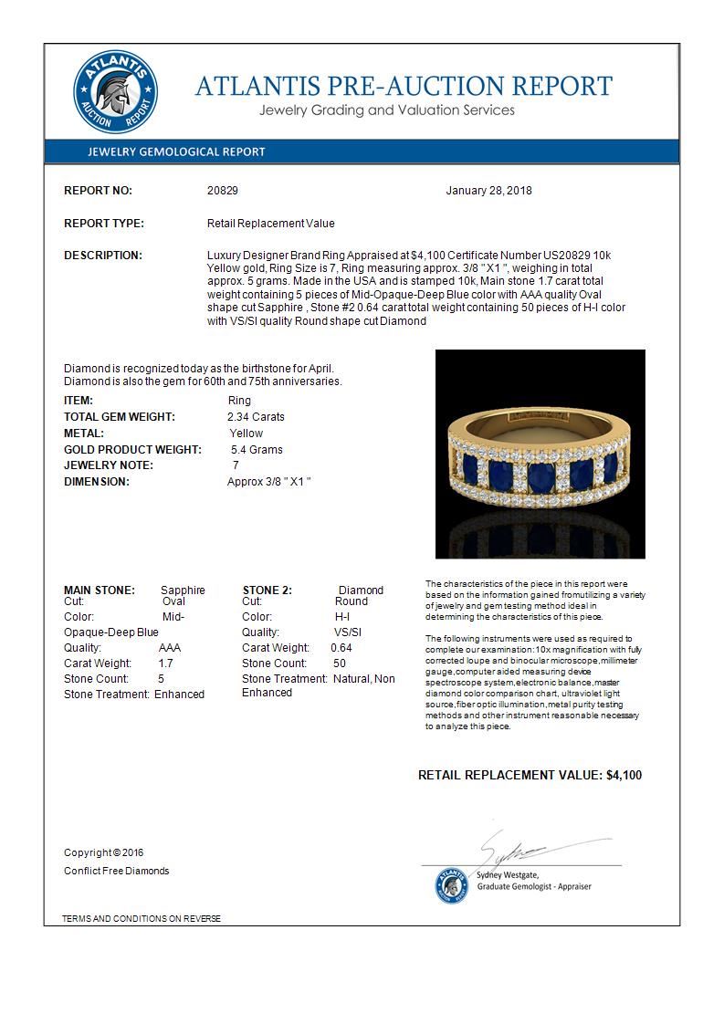 REF-61H8A -20829 ---- 2.34 CTW Sapphire & Micro Pave VS/SI Diamond Inspired Ring 10K Yellow Gold ---- Luxury Designer Brand Ring Appraised at $4,100 Certificate Number US20829 10k Yellow gold, Ring Size is 7, Ring measuring approx. 3/8 " X1 ", weighing in total approx. 5 grams. Made in the USA and is stamped 10k, Main stone 1.7 carat total weight containing 5 pieces of Mid-Opaque-Deep Blue color with AAA quality Oval shape cut Sapphire , Stone #2 0.64 carat total weight containing 50 pieces of H-I color with VS/SI quality Round shape cut Diamond