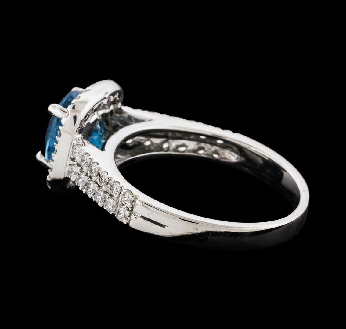 One Blue Zircon and Diamond Ring featuring: 14KT White Gold with a total weight of 3.80 grams, Blue Zircon with a total weight of 2.34ct, and side diamonds with a weight of 0.45ctw.