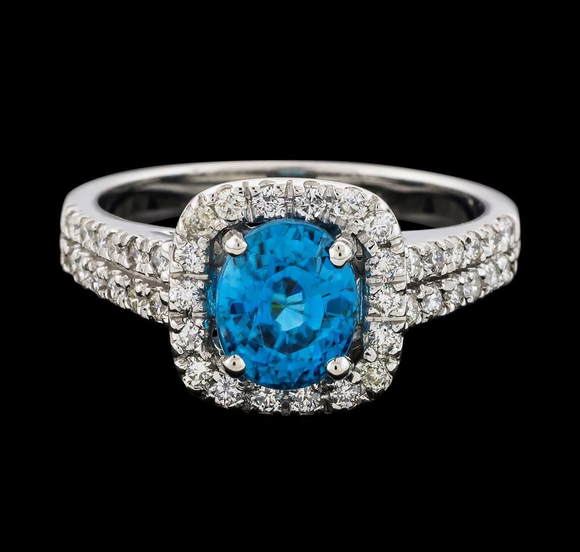 One Blue Zircon and Diamond Ring featuring: 14KT White Gold with a total weight of 3.80 grams, Blue Zircon with a total weight of 2.34ct, and side diamonds with a weight of 0.45ctw.