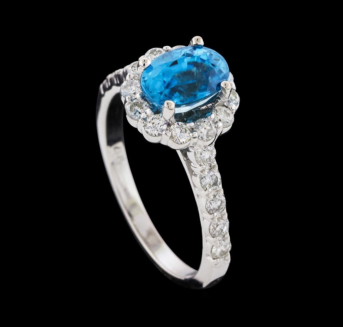 One Blue Zircon and Diamond Ring featuring: 14KT White Gold with a total weight of 3.70 grams, Blue Zircon with a total weight of 2.34ct, and side diamonds with a weight of 0.74ctw.