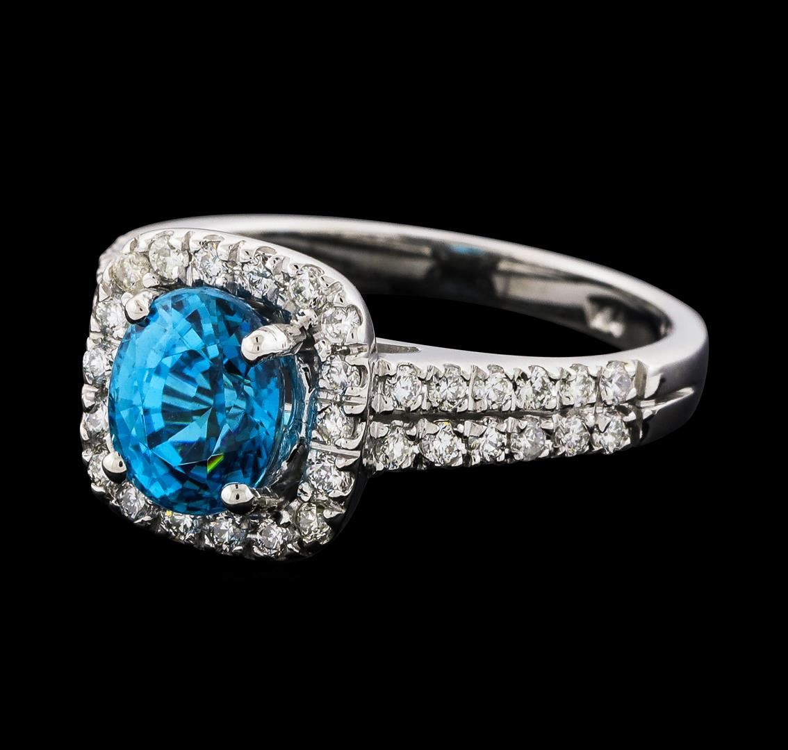One Blue Zircon and Diamond Ring featuring: 14KT White Gold with a total weight of 3.80 grams, Blue Zircon with a total weight of 2.34ct, and side diamonds with a weight of 0.45ctw.
