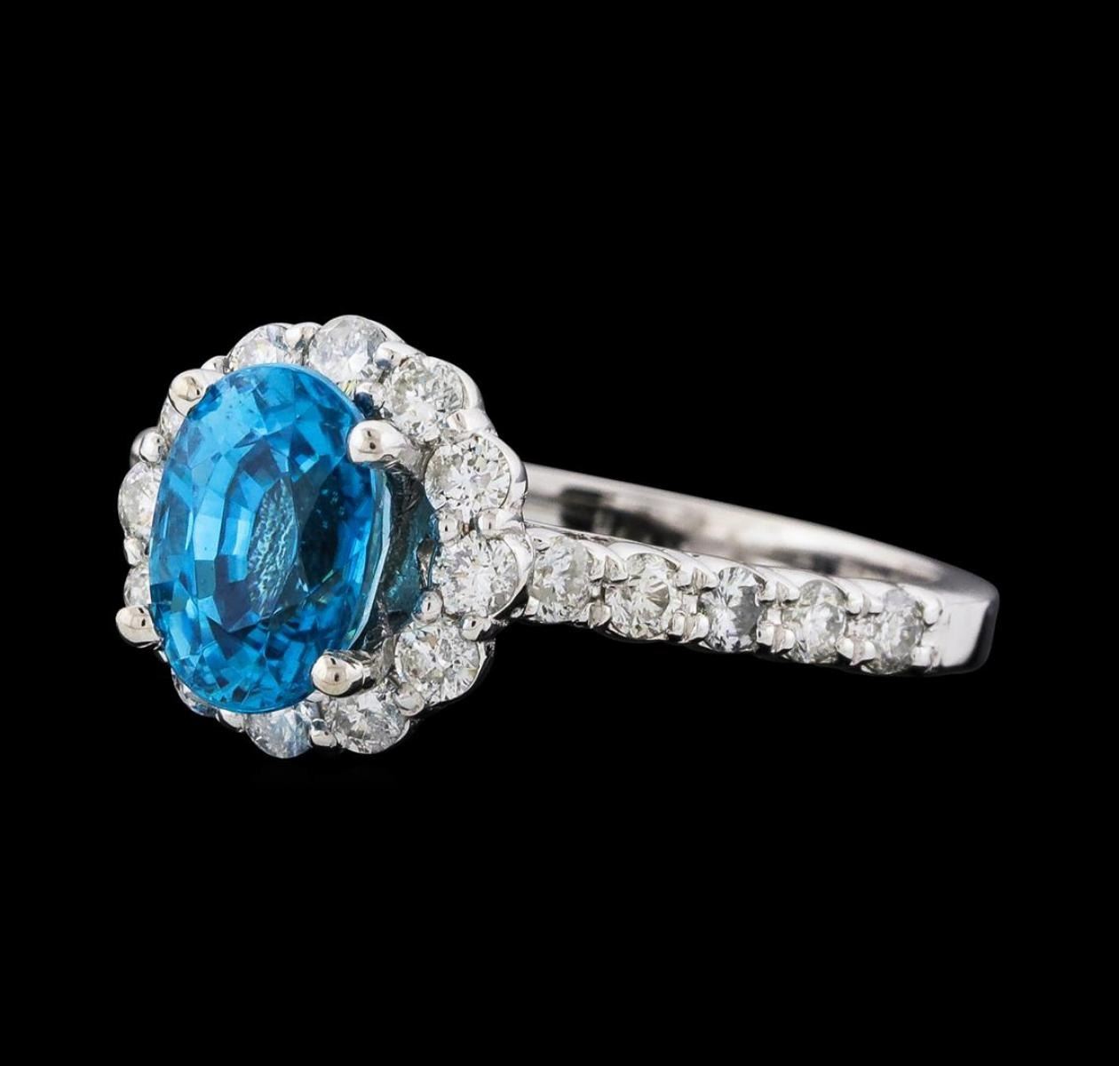 One Blue Zircon and Diamond Ring featuring: 14KT White Gold with a total weight of 3.70 grams, Blue Zircon with a total weight of 2.34ct, and side diamonds with a weight of 0.74ctw.
