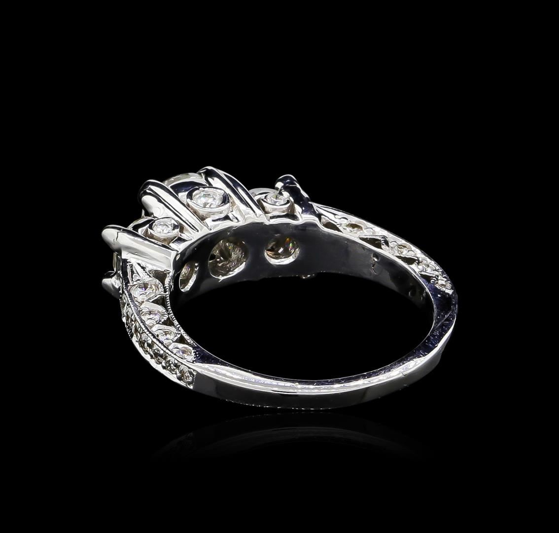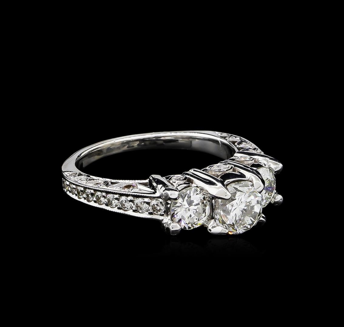 One electronically tested 18KT white gold ladies cast diamond unity ring. The unity ring features a series of three round brilliant diamonds supported by a diamond accented under gallery and diamond set shoulders, completed by a one and one-half millimeter wide band. Bright polish finish with milgrain detailing. Condition is good. Containing: One prong set round brilliant cut diamond, measuring 5.82 - 5.81 x 4.05mm (depth est.), 10.00.%. GTCF approximate weight of 1.01ct. Graded in the setting. Clarity: I-1. Color: 69.6%. Table 67.0%. Two prong set round brilliant cut diamonds, measuring 4.70 - 4.55 x 2.78mm (depth est.) approximate total weight of 2 Stones = 0.75ct. Graded in the setting. Clarity: SI-2. Color: I - J Eighteen bead & bezel set round brilliant cut diamonds, measuring 1.80 - 1.50 x 0.99mm (depth est.) approximate total weight of 18 Stones = 0.34ct. Graded in the setting. Clarity: SI-1 to I-1. Color: G - I Twenty-Two bead & bezel set round brilliant cut diamonds, measuring 1.40 - 1.20 x 0.78mm (depth est.) approximate total weight of 22 Stones = 0.24ct. Graded in the setting. Clarity: SI-1 to I-1. Color: G - I. Total Weight of Diamonds 2.34ct. Total Weight of Ring 6.90gm. AIG Appraised at $16,460.00.