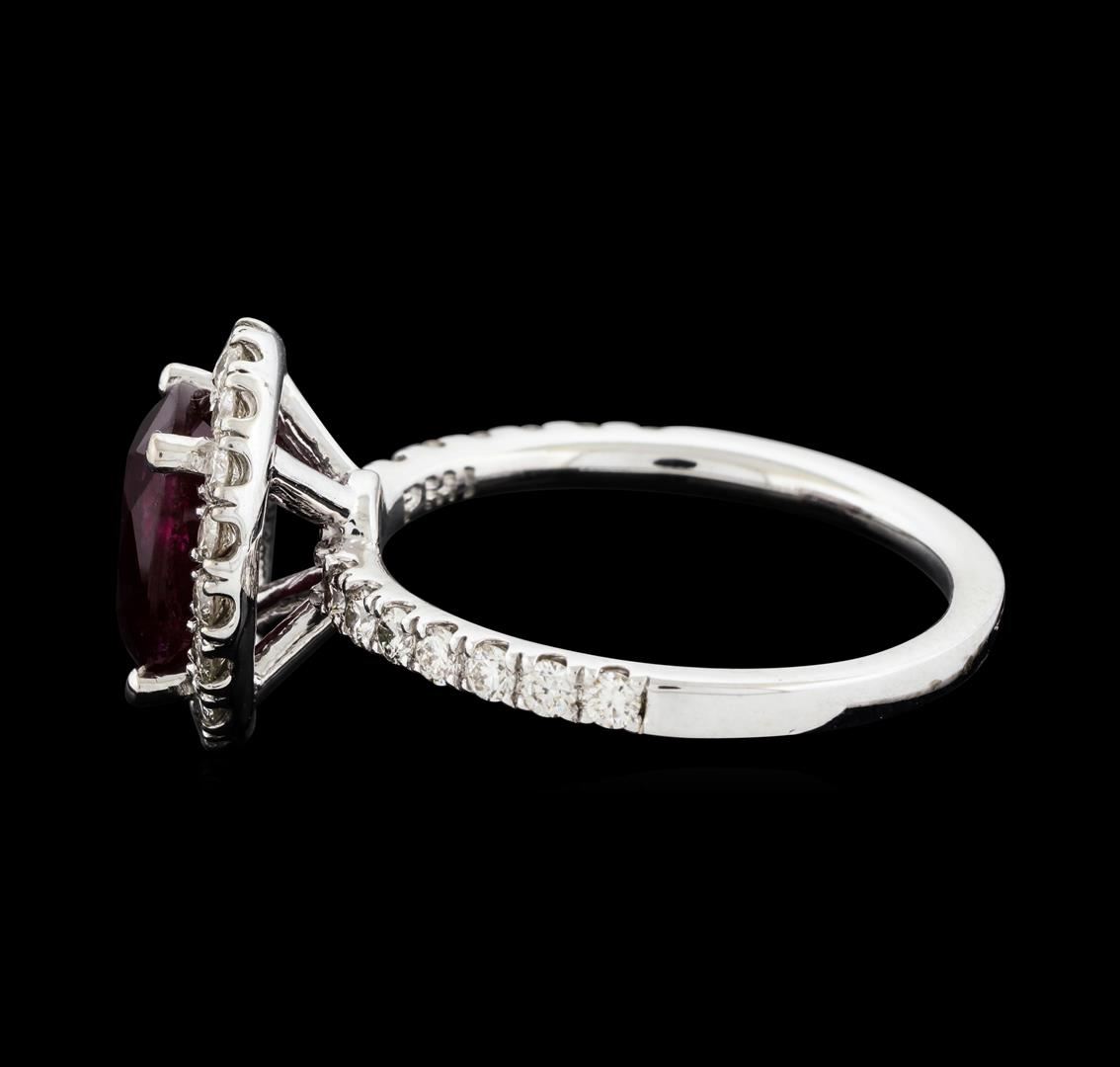 One electronically tested 14KT white gold lady's cast fashion ring with a halo with a bright polish finish. The featured lady's ring has a shank measuring 1.75 millimeters wide. Identified with markings of '14K'. Condition is new, good workmanship. Containing: One prong set oval modified mixed cut natural ruby, measuring 9.13 x 6.88 x 3.81mm, (depth est.) 15%. bulge factor, approximate weight of 2.34ct., clarity is heavily included, dark, moderately strong, red color, (GIA R 7/4), cut is good. Transmitting light somewhat diffusely, semi-transparent to translucent. Naturally occurring internal & external characteristics are present. Indications of laboratory high temperature heat treatment. Colored gemstones are presumed to have been subjected to commonly used enhancement processes. Graded in the setting. Thirty-Two prong set round brilliant cut diamonds, measuring 1.75 - 1.65 x 1.05mm (depth est.) approximate total weight of 32 Stones = 0.59ct. Graded in the setting. Clarity VS-2 to SI-1. Color: H - I Cut Good. Total Weight of Colored Stones 2.34ct.. Total Weight of Diamonds 0.59ct.. Total Weight of Ring 3.60gm. GAS Appraised at $5,350.00.