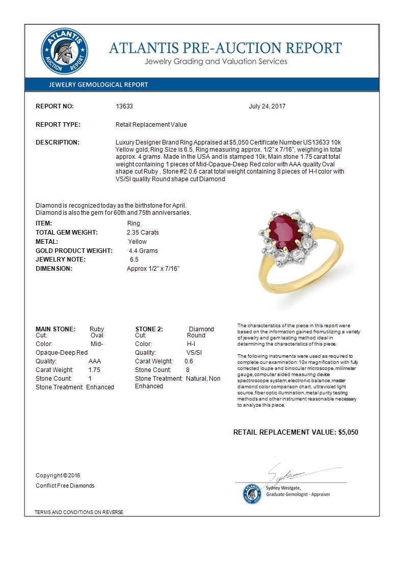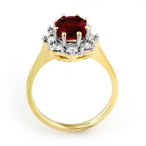 2.35 CTW Ruby & Diamond Ring 10K Yellow Gold ---- Luxury Designer Brand Ring Appraised Retail Price at $5,050 ---- SKU Number US13633 10k Yellow gold Ring Size is 6.5, Ring measuring approx. 1/2" x 7/16", weighing in total approx. 4 grams. Made in the USA and is stamped 10k, Main stone 1.75 carat total weight containing 1 pieces of Mid-Opaque-Deep Red color with AAA quality Oval shape cut Ruby , Stone #2 0.6 carat total weight containing 8 pieces of H-I color with VS/SI quality Round shape cut