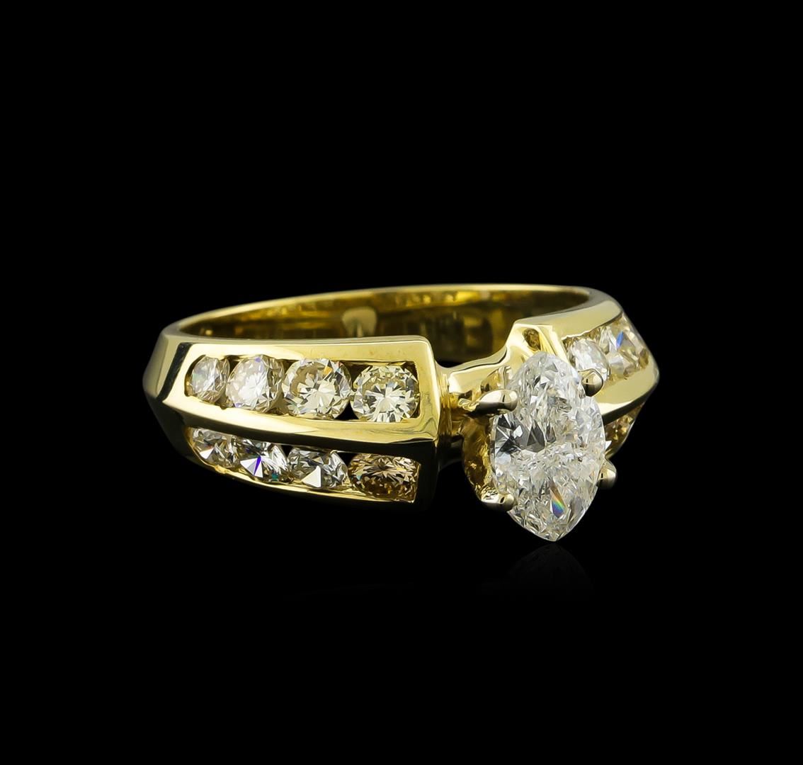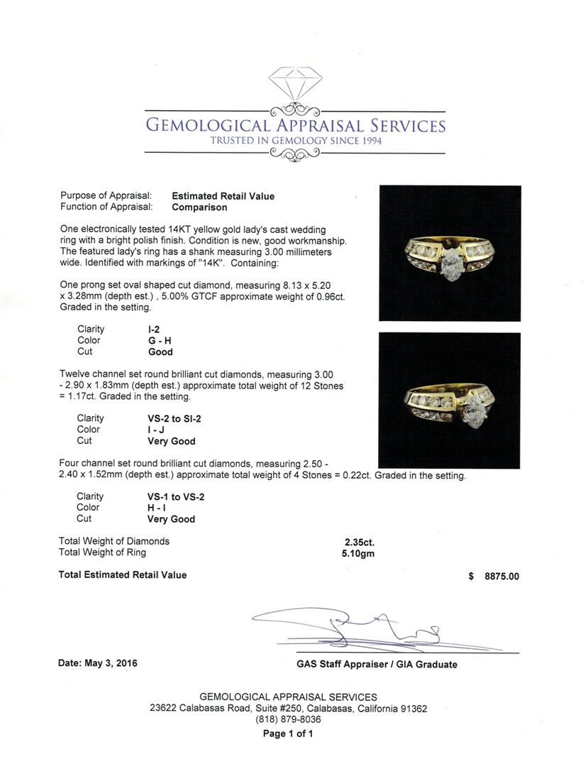 One electronically tested 14KT yellow gold lady's cast wedding ring with a bright polish finish. The featured lady's ring has a shank measuring 3.00 millimeters wide. Identified with markings of "14K". Condition is new, good workmanship. Containing: One prong set oval shaped cut diamond, measuring 8.13 x 5.20 x 3.28mm (depth est.) , 5.00.%. GTCF approximate weight of 0.96ct. Graded in the setting. Clarity: I-2. Color: G - Good Twelve channel set round brilliant cut diamonds, measuring 3.00 - 2.90 x 1.83mm (depth est.) approximate total weight of 12 Stones = 1.17ct. Graded in the setting. Clarity: VS-2 to SI-2. Color: I - Very Good Four channel set round brilliant cut diamonds, measuring 2.50 - 2.40 x 1.52mm (depth est.) approximate total weight of 4 Stones = 0.22ct. Graded in the setting. Clarity: VS-1 to VS-2. Color: H - I. Cut Very Good. Total Weight of Diamonds 2.35ct. Total Weight of Ring 5.10gm GAS Appraised at $8,875.00.