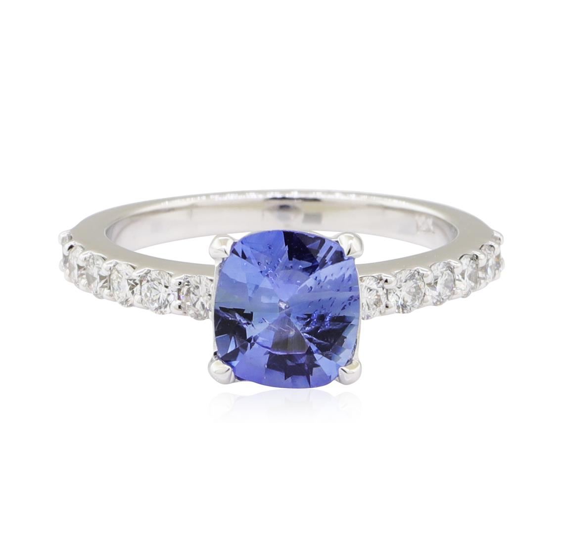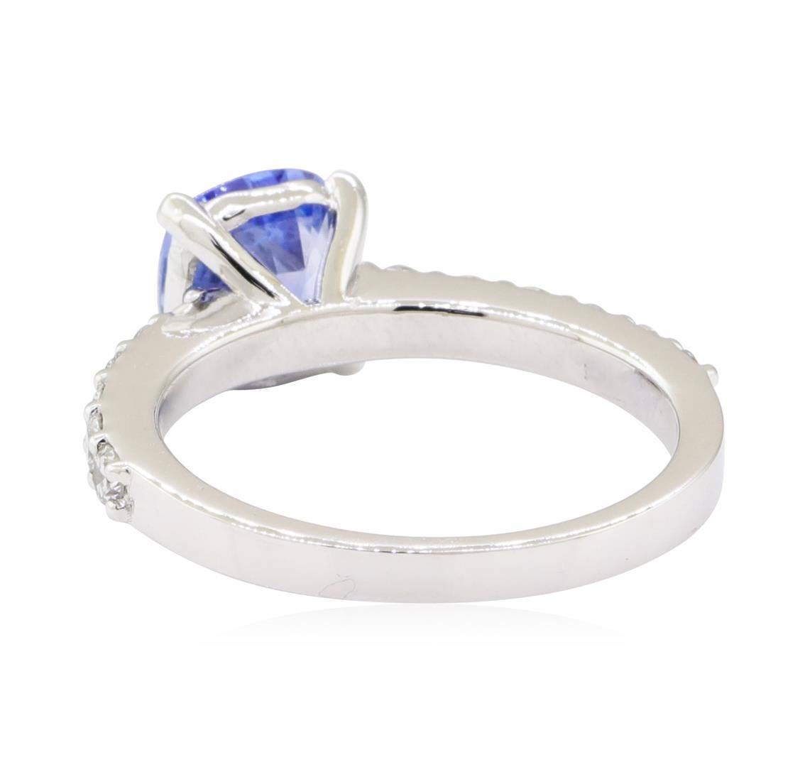 One electronically tested 14KT white gold lady's cast fashion ring with a straight line cathedral shank with a bright polish finish. The featured lady's ring has a shank measuring 2.10 millimeters wide. Identified with markings of '14K'. Condition is new, good workmanship. Containing: One prong set rectangular cushion modified brilliant cut natural blue sapphire, measuring 7.67 x 7.04 x 3.80mm, (depth est.) approximate weight of 1.93ct., clarity is slightly included, medium light, strong, violetish blue color, (GIA vB 4/5), cut is good. Transmitting light with a minimum of distortion, transparent. Colored gemstones are presumed to have been subjected to commonly used enhancement processes. Graded in the setting. Twelve prong set round brilliant cut diamonds, measuring 2.15 - 2.10 x 1.28mm (depth est.) approximate total weight of 12 Stones = 0.42ct. Graded in the setting. Color H - I Clarity VS-2 to SI-1 Cut Very Good. Total Weight of Colored Stones 1.93ct.. Total Weight of Diamonds 0.42ct.. Total Weight of Ring 3.70gm GAS Appraised at $4735.00. GAS Appraised.