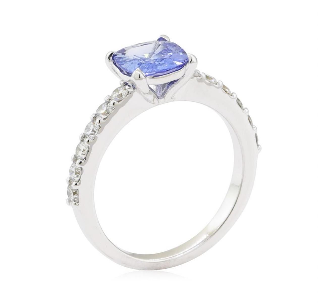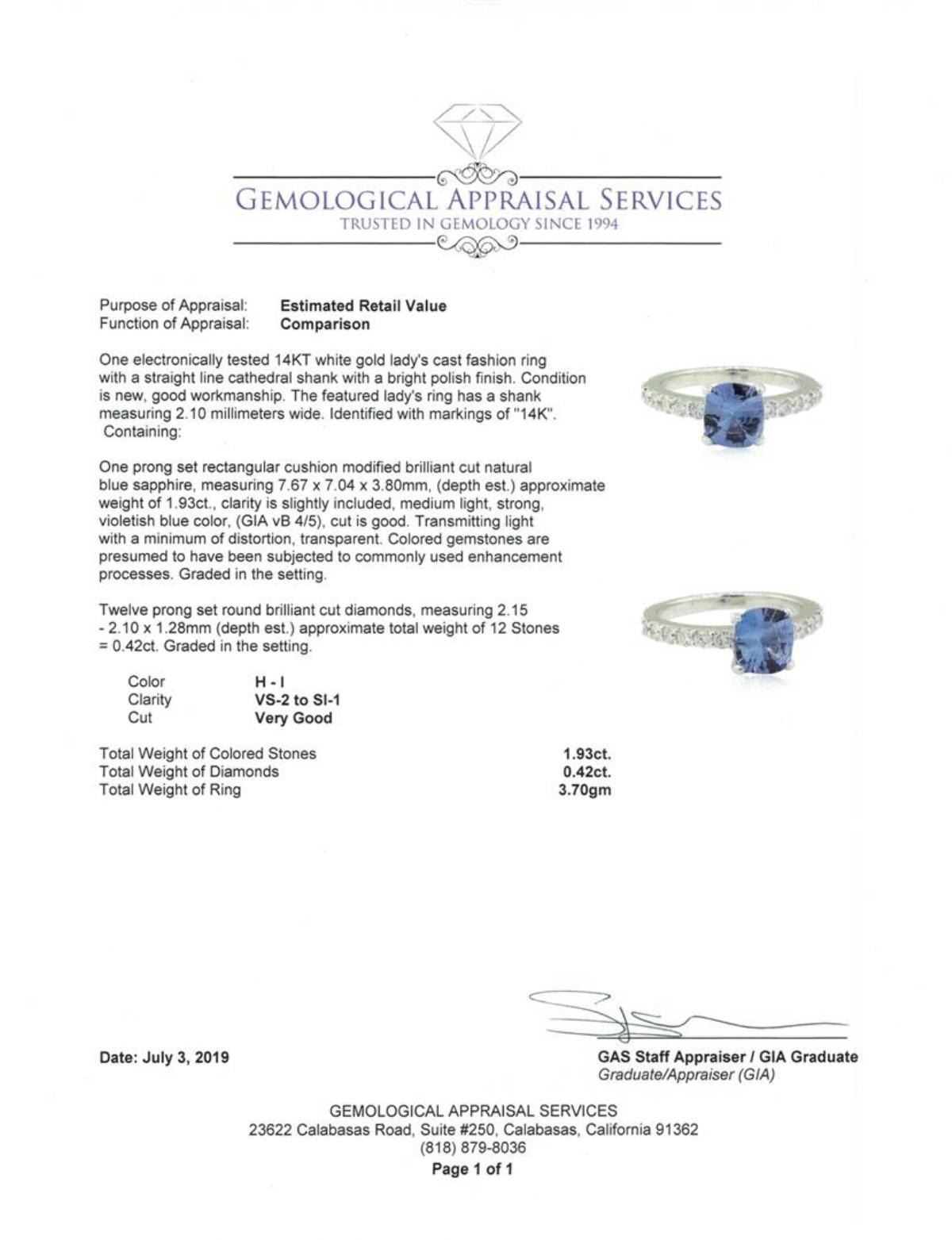 One electronically tested 14KT white gold lady's cast fashion ring with a straight line cathedral shank with a bright polish finish. The featured lady's ring has a shank measuring 2.10 millimeters wide. Identified with markings of '14K'. Condition is new, good workmanship. Containing: One prong set rectangular cushion modified brilliant cut natural blue sapphire, measuring 7.67 x 7.04 x 3.80mm, (depth est.) approximate weight of 1.93ct., clarity is slightly included, medium light, strong, violetish blue color, (GIA vB 4/5), cut is good. Transmitting light with a minimum of distortion, transparent. Colored gemstones are presumed to have been subjected to commonly used enhancement processes. Graded in the setting. Twelve prong set round brilliant cut diamonds, measuring 2.15 - 2.10 x 1.28mm (depth est.) approximate total weight of 12 Stones = 0.42ct. Graded in the setting. Color H - I Clarity VS-2 to SI-1 Cut Very Good. Total Weight of Colored Stones 1.93ct.. Total Weight of Diamonds 0.42ct.. Total Weight of Ring 3.70gm GAS Appraised at $4735.00. GAS Appraised.