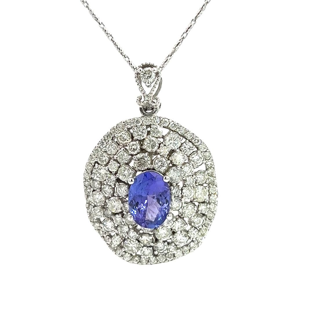 One electronically tested 14KT white gold lady's combination cast & assembled fashion freeform pendant and chain 18.0" long, 1mm fancy link with a lobster claw clasp with a oval motif with a bright polish finish. The featured lady's pendant has a drop of approximately 35 millimeters. Identified with markings of "14K". Condition is new, good workmanship. Containing: One prong set oval modified brilliant cut natural tanzanite, measuring 9.95 x 7.35 x 4.55mm, (depth est.) approximate weight of 2.35ct., clarity is eye clean, medium light, moderately strong, violet color, (GIA V 4/4), cut is good. Transmitting light with no distortion, transparent. Colored gemstones are presumed to have been subjected to commonly used enhancement processes. Graded in the setting. Forty-Eight prong set round brilliant cut diamonds, measuring 1.35 - 1.30 x 0.82mm (depth est.) approximate total weight of 48 Stones = 0.42ct. Graded in the setting. Color H - I Clarity SI-2 to I-1 Cut Good Fifty-Two prong set round brilliant cut diamonds, measuring 3.00 - 2.20 x 1.61mm (depth est.) approximate total weight of 52 Stones = 3.45ct. Graded in the setting. Color H - I Clarity SI-1 to I-1 Cut Good Total Weight of Colored Stones 2.35ct. Total Weight of Diamonds 3.87ct. Total Weight of Pendant And Chain 12.50gm Estimated Retail Value $ 12600.00
