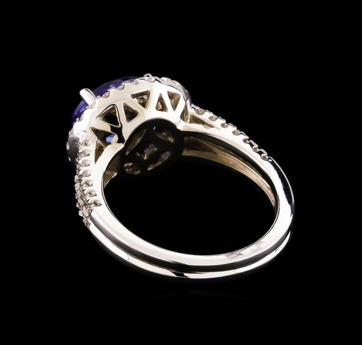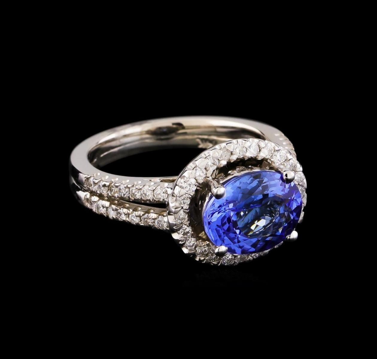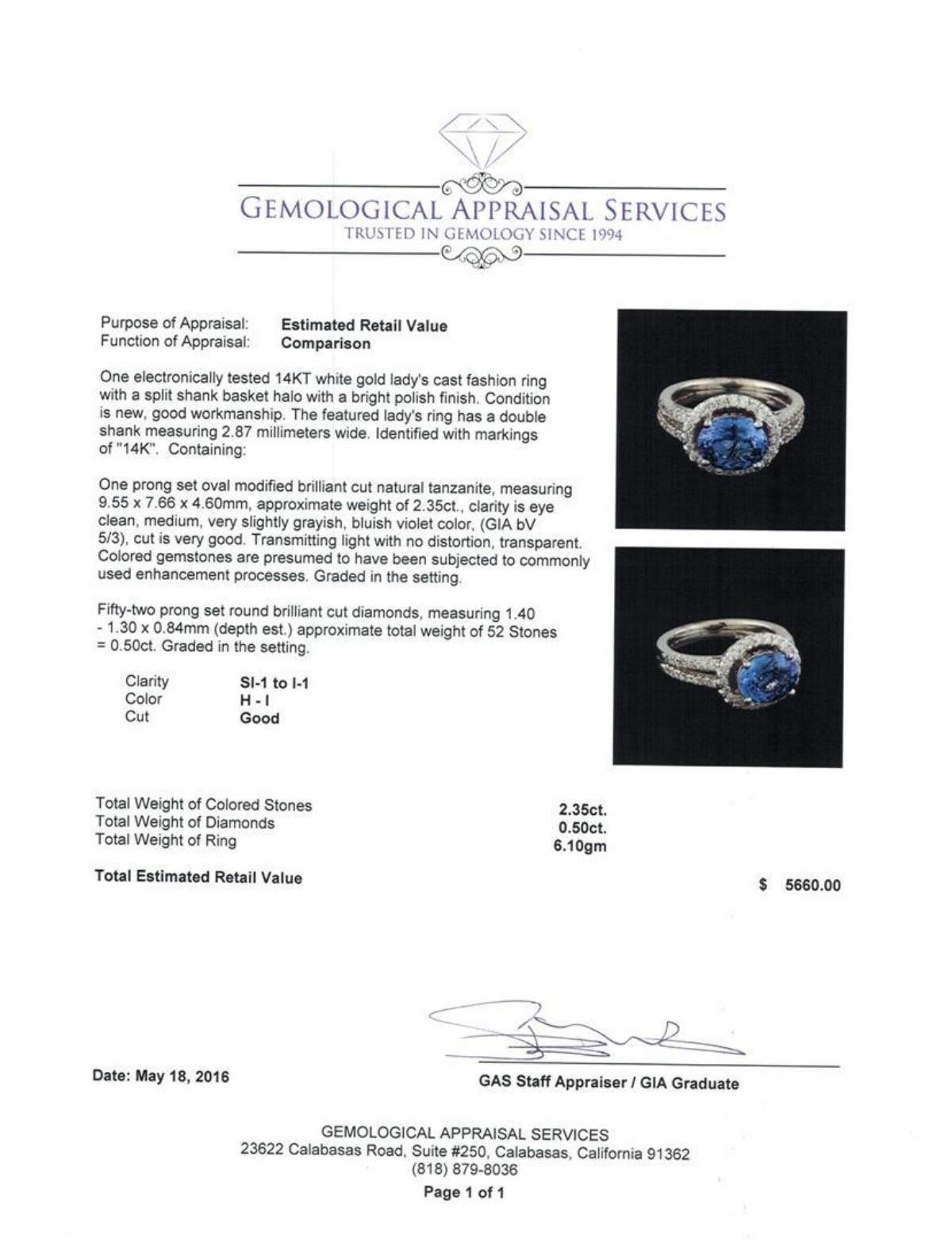 One electronically tested 14KT white gold lady's cast fashion ring with a split shank basket halo with a bright polish finish. The featured lady's ring has a double shank measuring 2.87 millimeters wide. Identified with markings of "14K". Condition is new, good workmanship. Containing: One prong set oval modified brilliant cut natural tanzanite, measuring 9.55 x 7.66 x 4.60mm, approximate weight of 2.35ct., clarity is eye clean, medium, very slightly grayish, bluish violet color, (GIA bV 5/3), cut is very good. Transmitting light with no distortion, transparent. Colored gemstones are presumed to have been subjected to commonly used enhancement processes. Graded in the setting. Fifty-Two prong set round brilliant cut diamonds, measuring 1.40 - 1.30 x 0.84mm (depth est.) approximate total weight of 52 Stones = 0.50ct. Graded in the setting. Clarity: SI-1 to I-1. Color: H - I. Cut Good. Total Weight of Colored Stones 2.35ct. Total Weight of Diamonds 0.50ct. Total Weight of Ring 6.10gm. GAS Appraised.
