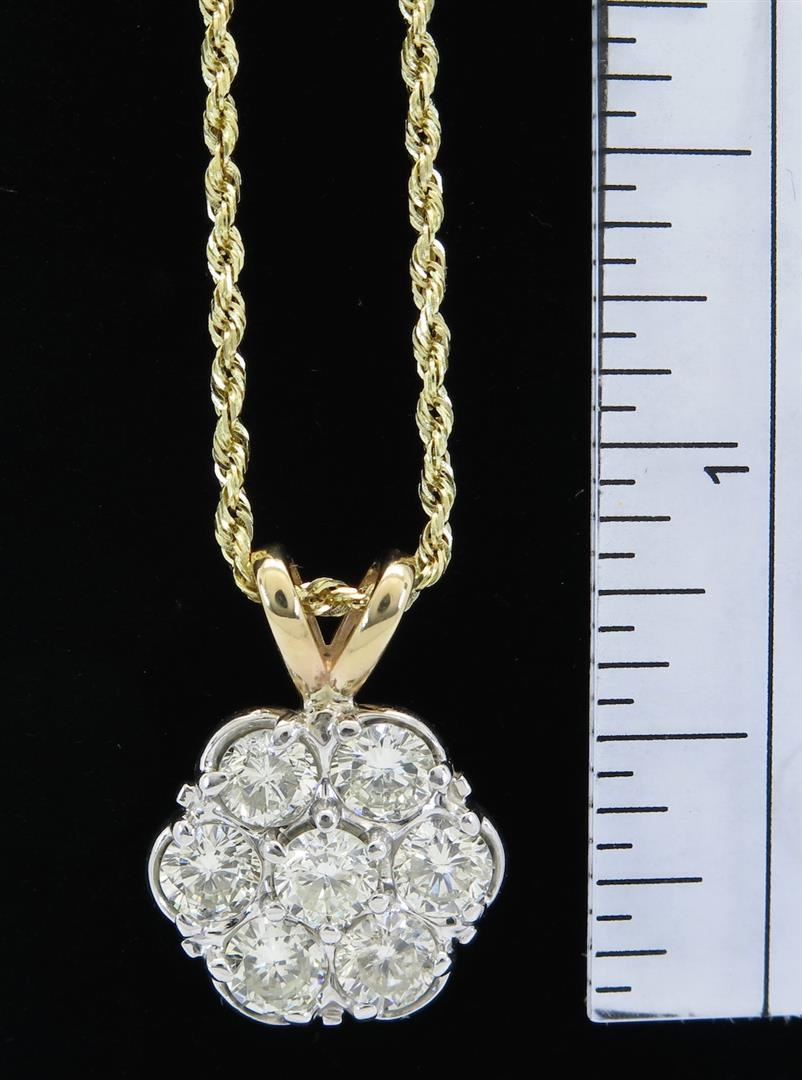 One tested 14K gold diamond pendant. Containing: Seven Round Brilliant Cut Diamonds. Clarity: I-SI, Color: I-J. Approximate total diamond weight: 2.35CTW. Diamonds are graded in the mounting, unless otherwise stated. Weight of necklace 7.0 grams. Size of chain: 20" long.