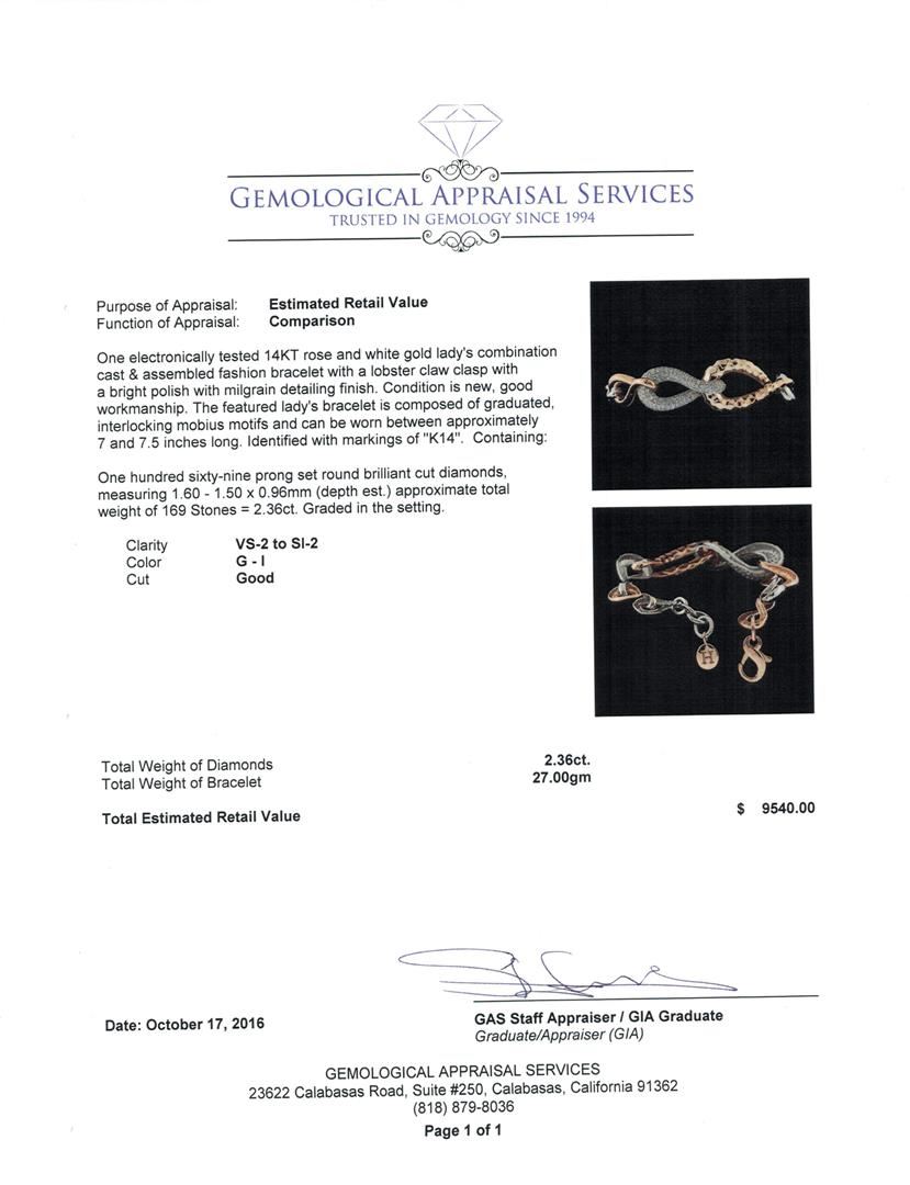 One electronically tested 14KT rose and white gold lady's combination cast & assembled fashion bracelet with a lobster claw clasp with a bright polish with milgrain detailing finish. The featured lady's bracelet is composed of graduated, interlocking mobius motifs and can be worn between approximately 7 and 7.5 inches long. Identified with markings of 'K14'. Condition is new, good workmanship. Containing: One Hundred Sixty-Nine prong set round brilliant cut diamonds, measuring 1.60 - 1.50 x 0.96mm (depth est.) approximate total weight of 169 Stones = 2.36ct. Graded in the setting. Clarity VS-2 to SI-2. Color: G - I Cut Good. Total Weight of Diamonds 2.36ct.. Total Weight of Bracelet 27.00gm. GAS Appraised.