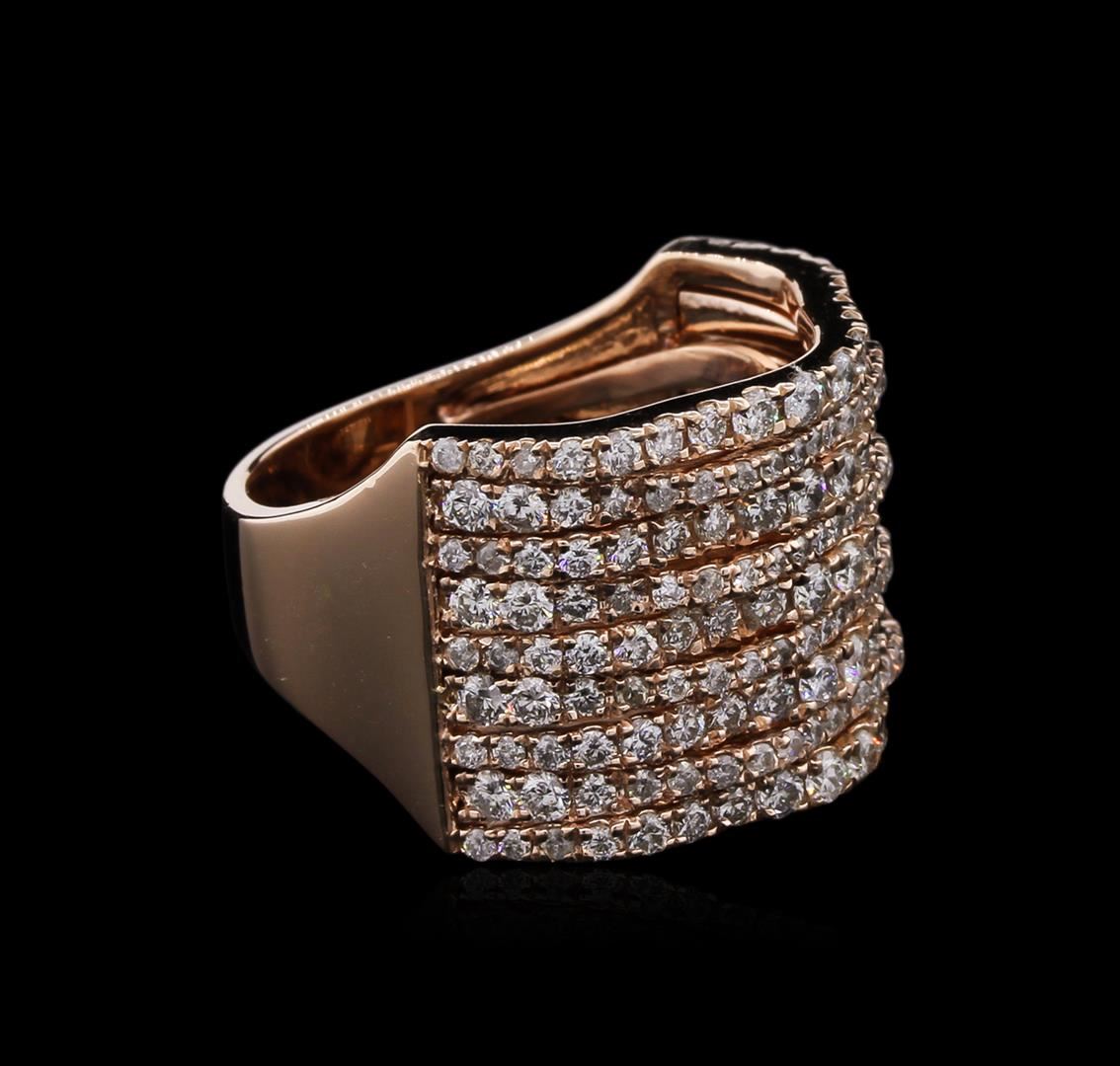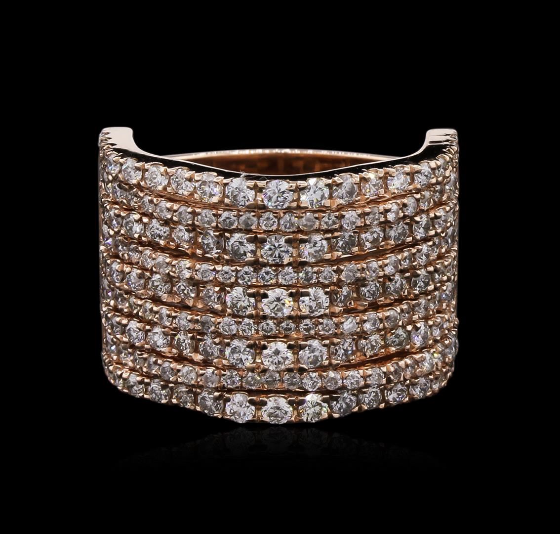 One electronically tested 14KT rose gold lady's combination cast & assembled fashion ring with a tapered shank with a bright polish finish. The featured lady's ring has a shank measuring 4.56 millimeters wide. Identified with markings of "K14". Condition is new, good workmanship. Containing: One Hundred Eighty-Four prong set round brilliant cut diamonds, measuring 1.90 - 1.20 x 0.93mm (depth est.) approximate total weight of 184 Stones = 2.36ct. Graded in the setting. Clarity: VS-2 to I-1. Color: G - I. Cut Good. Total Weight of Diamonds 2.36ct. Total Weight of Ring 13.30gm. GAS Appraised at $8,820.00.