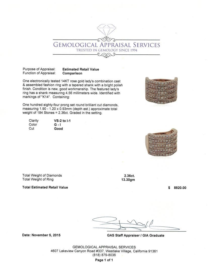 One electronically tested 14KT rose gold lady's combination cast & assembled fashion ring with a tapered shank with a bright polish finish. The featured lady's ring has a shank measuring 4.56 millimeters wide. Identified with markings of "K14". Condition is new, good workmanship. Containing: One Hundred Eighty-Four prong set round brilliant cut diamonds, measuring 1.90 - 1.20 x 0.93mm (depth est.) approximate total weight of 184 Stones = 2.36ct. Graded in the setting. Clarity: VS-2 to I-1. Color: G - I. Cut Good. Total Weight of Diamonds 2.36ct. Total Weight of Ring 13.30gm. GAS Appraised.