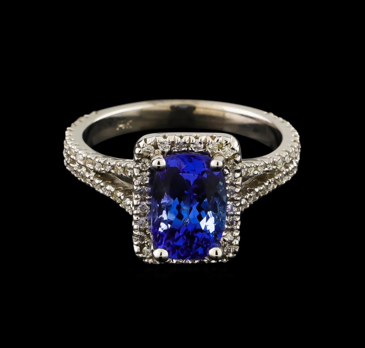 One electronically tested 14KT white gold lady's cast fashion ring with a split shank halo with a bright polish finish. The featured lady's ring has a shank measuring 2.47 millimeters wide. Identified with markings of "14K". Condition is new, good workmanship. Containing: One prong set rectangular cushion modified brilliant cut natural tanzanite, measuring 9.05 x 6.15 x 5.34mm, approximate weight of 2.36ct., clarity is eye clean, medium dark, moderately strong, violetish blue color, (GIA vB 6/4), cut is good. Graded in the setting. One Hundred Four prong set round brilliant cut diamonds, measuring 1.15 - 1.05 x 0.67mm (depth est.) approximate total weight of 104 Stones = 0.51ct. Graded in the setting. Clarity: SI-1 to I-1. Color: H - I. Cut Good. Total Weight of Colored Stones 2.36ct. Total Weight of Diamonds 0.51ct. Total Weight of Ring 3.80gm.