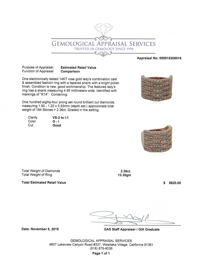 One electronically tested 14KT rose gold lady's combination cast & assembled fashion ring with a tapered shank with a bright polish finish. The featured lady's ring has a shank measuring 4.56 millimeters wide. Identified with markings of "K14". Condition is new, good workmanship. Containing: One Hundred Eighty-Four prong set round brilliant cut diamonds, measuring 1.90 - 1.20 x 0.93mm (depth est.) approximate total weight of 184 Stones = 2.36ct. Graded in the setting. Clarity: VS-2 to I-1. Color: G - I. Cut Good. Total Weight of Diamonds 2.36ct. Total Weight of Ring 13.30gm. GAS Appraised at $8,820.00.