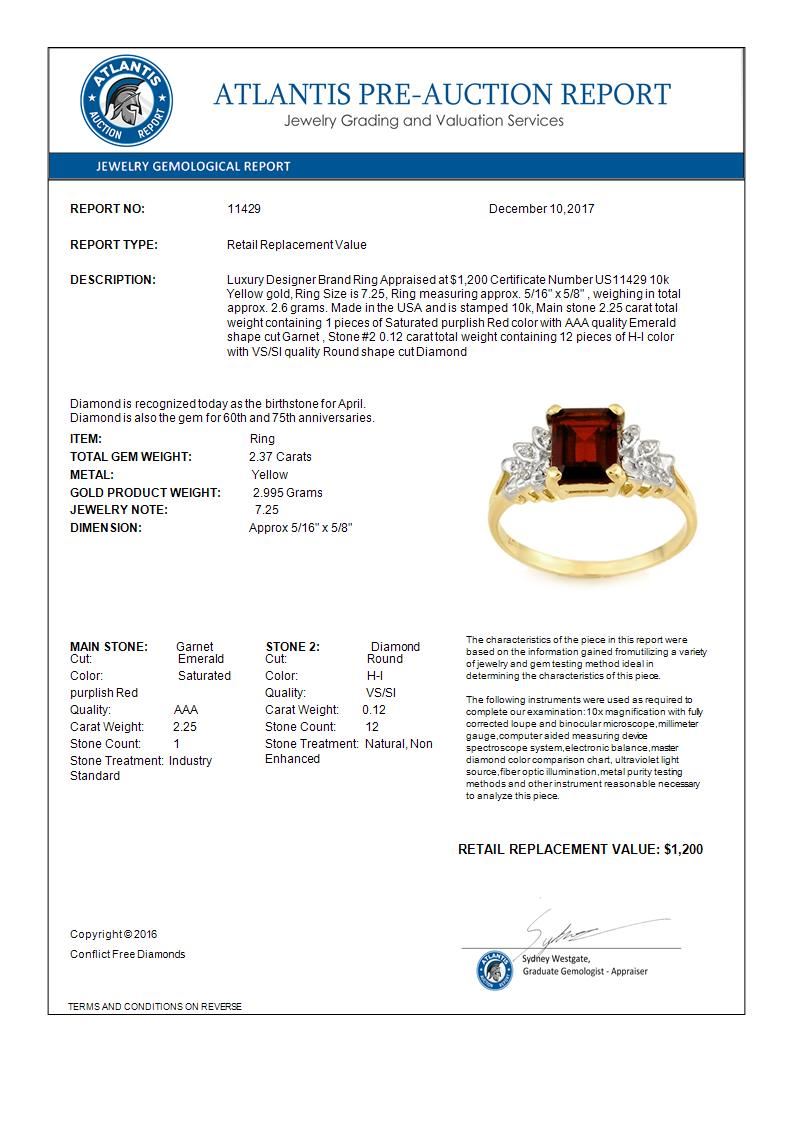 REF-19K6W -11429 ---- 2.37 CTW Garnet & Diamond Ring 10K Yellow Gold ---- Luxury Designer Brand Ring Appraised at $1,200 Certificate Number US11429 10k Yellow gold, Ring Size is 7.25, Ring measuring approx. 5/16" x 5/8" , weighing in total approx. 2.6 grams. Made in the USA and is stamped 10k, Main stone 2.25 carat total weight containing 1 pieces of Saturated purplish Red color with AAA quality Emerald shape cut Garnet , Stone #2 0.12 carat total weight containing 12 pieces of H-I color with VS/SI quality Round shape cut Diamond