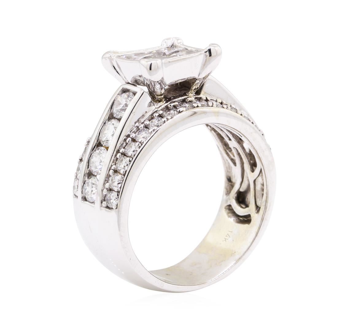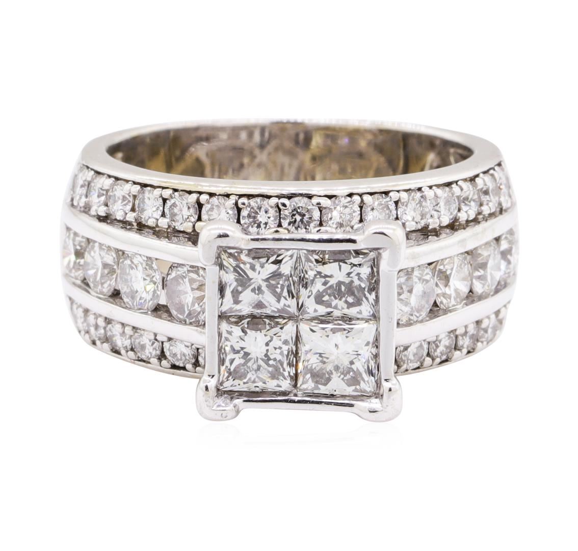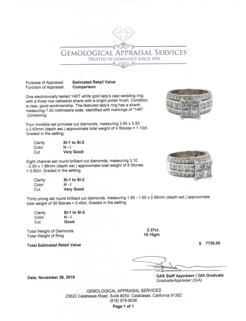 One electronically tested 14KT white gold lady's cast wedding ring with a three row cathedral shank with a bright polish finish. The featured lady's ring has a shank measuring 7.50 millimeters wide. Identified with markings of '14K'. Condition is new, good workmanship. Containing: Four invisible set princess cut diamonds, measuring 3.60 x 3.50 x 2.63mm (depth est.) approximate total weight of 4 Stones = 1.10ct. Graded in the setting. Color H - I Clarity SI-1 to SI-2 Cut Very Good Eight channel set round brilliant cut diamonds, measuring 3.10 - 2.90 x 1.86mm (depth est.) approximate total weight of 8 Stones = 0.82ct. Graded in the setting. Color H - I Clarity SI-1 to SI-2 Cut Very Good Thirty prong set round brilliant cut diamonds, measuring 1.60 - 1.55 x 0.98mm (depth est.) approximate total weight of 30 Stones = 0.45ct. Graded in the setting. Color H - I Clarity SI-1 to SI-2 Cut Good. Total Weight of Diamonds 2.37ct.. Total Weight of Ring 10.10gm GAS Appraised at $7720.00. GAS Appraised at $7,720.00.