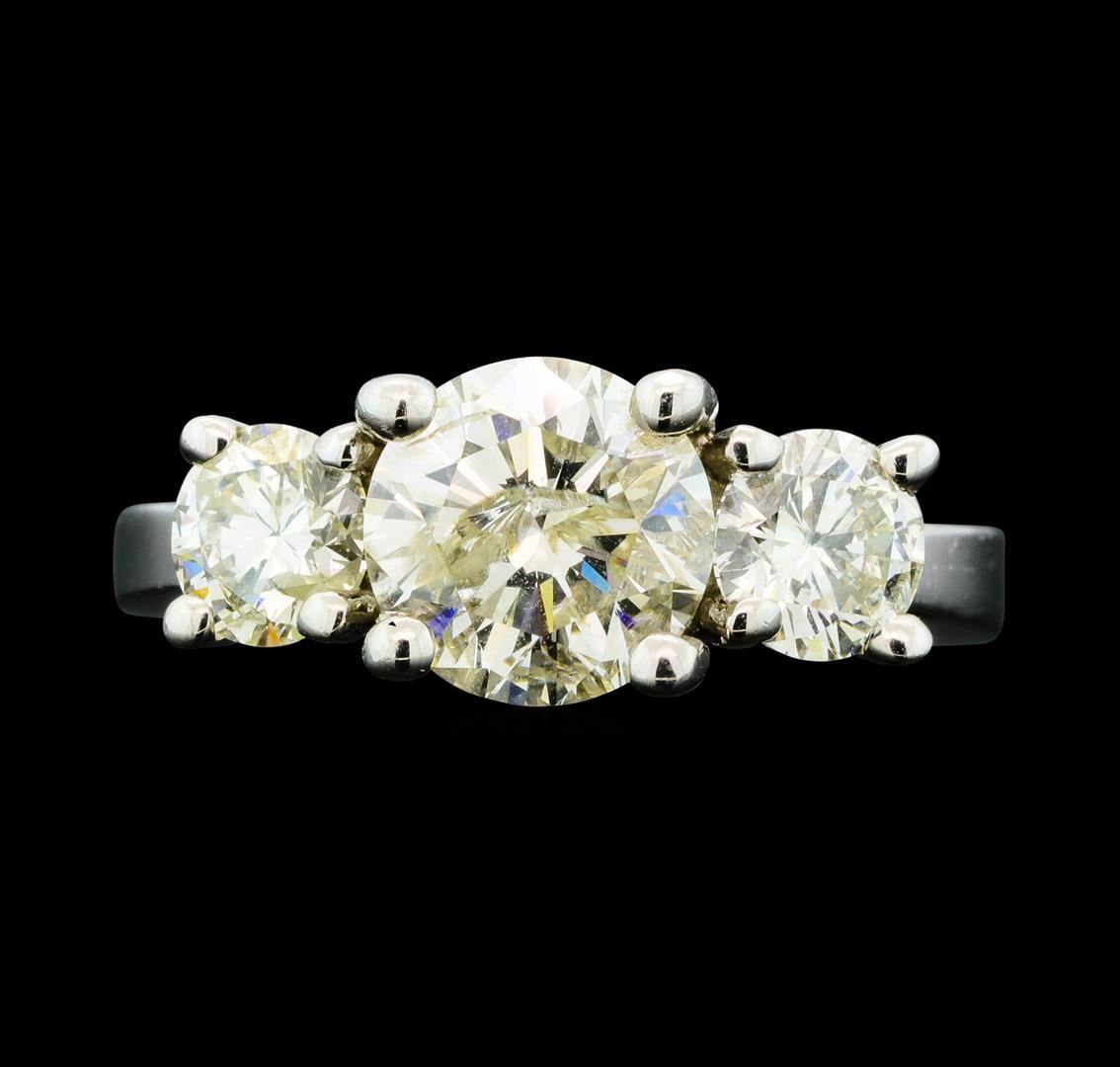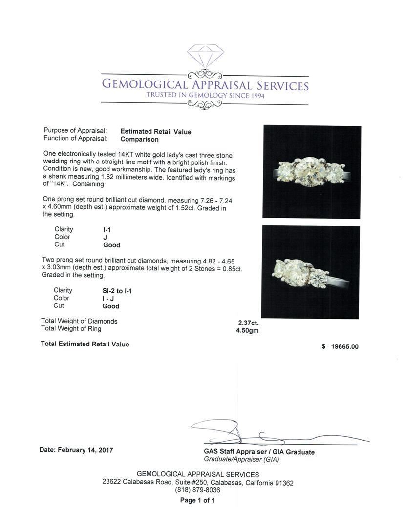 One electronically tested 14KT white gold lady's cast three stone wedding ring with a straight line motif with a bright polish finish. The featured lady's ring has a shank measuring 1.82 millimeters wide. Identified with markings of '14K'. Condition is new, good workmanship. Containing: One prong set round brilliant cut diamond, measuring 7.26 - 7.24 x 4.60mm (depth est.) approximate weight of 1.52ct. Graded in the setting. Clarity I-1. Color: J Cut Good Two prong set round brilliant cut diamonds, measuring 4.82 - 4.65 x 3.03mm (depth est.) approximate total weight of 2 Stones = 0.85ct. Graded in the setting. Clarity SI-2 to I-1. Color: I - J Cut Good. Total Weight of Diamonds 2.37ct.. Total Weight of Ring 4.50gm. GAS Appraised.