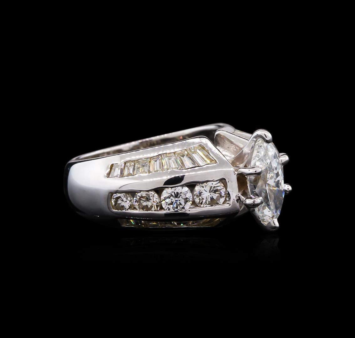 One electronically tested 18KT white gold lady's combination cast & assembled wedding ring with a bright polish finish. The featured lady's ring has a shank measuring 3.91 millimeters in width. Identified with markings of "18K". Condition is new, good workmanship. Containing: One prong set marquise shaped cut diamond, measuring 8.90 x 4.90 x 3.10mm (depth est.) approximate weight of 0.79ct. Graded in the setting. Clarity: SI-2. Color: F - Good Eight channel set round brilliant cut diamonds, measuring 3.20 - 2.30 x 1.79mm (depth est.) approximate total weight of 8 Stones = 0.66ct. Graded in the setting. Clarity: VS-2 to SI-2. Color: H - Good Twenty-Four channel set baguette cut diamonds, measuring from 1.80 x 1.20 x 1.02mm (depth est.) to 3.20 x 1.60 x 1.36mm (depth est.) approximate total weight of 24 Stones = 0.92ct. Graded in the setting. Clarity: VS-2 to SI-2. Color: H - I. Cut Good. Total Weight of Diamonds 2.37ct. Total Weight of Ring 7.90gm. GAS Appraised at $8,765.00.