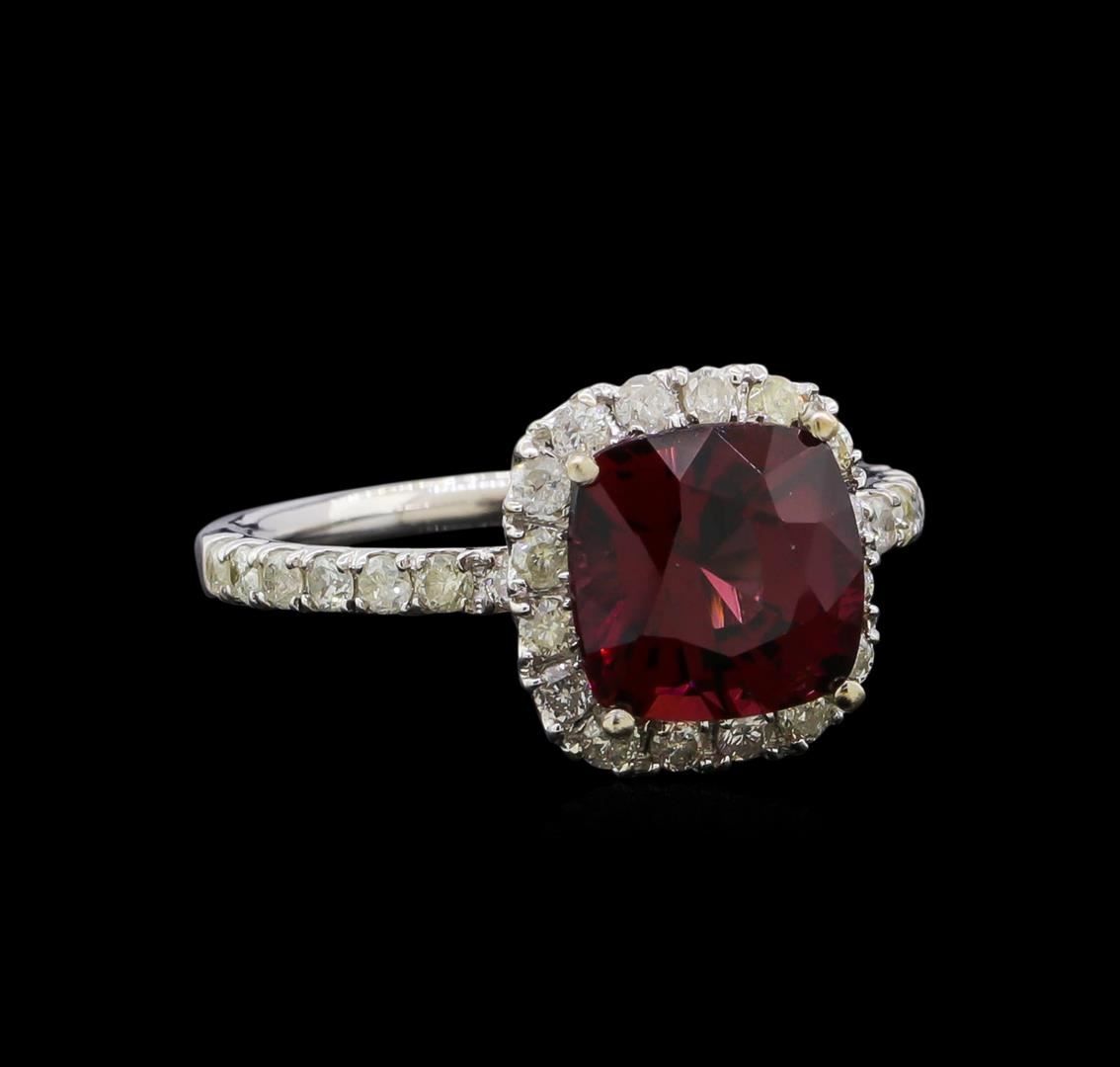 14K Gold Garnet & Diamond Ring. One polished, stamped, and tested 14K white gold ring mounted with: 1 genuine faceted garnet center stone weighing 2.37 carat, and 30 genuine faceted round diamonds weighing 0.45 carats. This item weighs 2.6 grams, condition is new, excellent workmanship. Main Gemstones. Group: Natural garnet. Species: Pyrope. Shape: Cushion. Cutting style: Brilliant cut crown. Modified brilliant cut pavilion. Measurements: 7.48x7.67 mm. Weight: 2.37 carat. Color: Slightly orangy red. Cut grade: Very good. Refractive index: 1.74/SR. Hardness: 7. Adjacent gemstones on Ring: Identity: Natural diamond. Shape: Round. Cutting Style: Brilliant cut. Quantity: 30 Diamonds. Measurements: 1.6-1.8 mm. Total weight: 0.45 carats. clarity grade: SI2-I2. color grade: H-J. Refractive index: 2.418. Hardness: 10. Gold Content: 14K white gold. AIGL Appraised at $2,048.00.