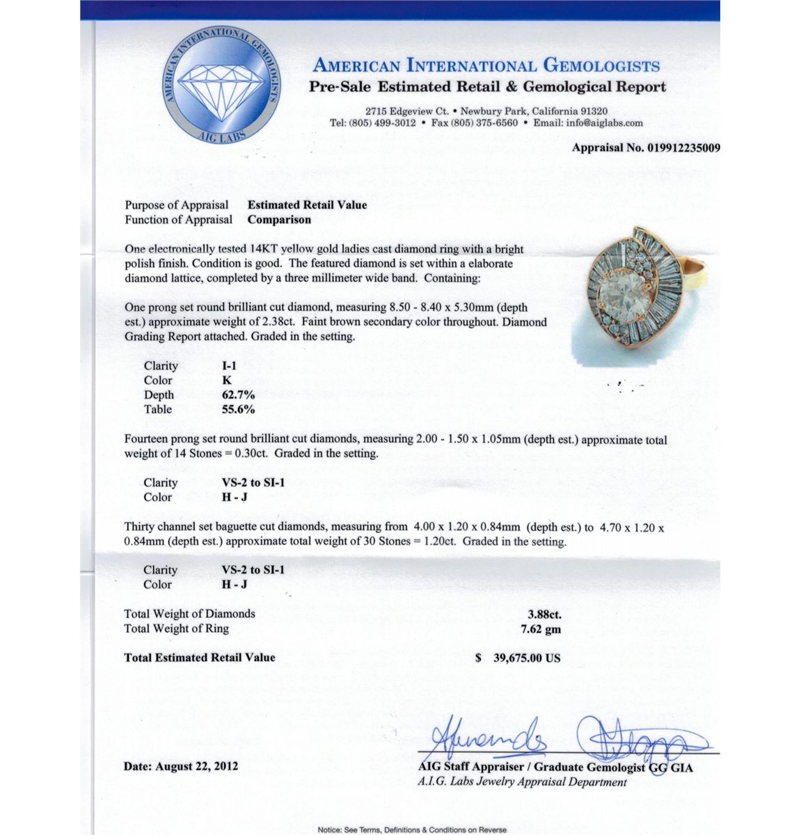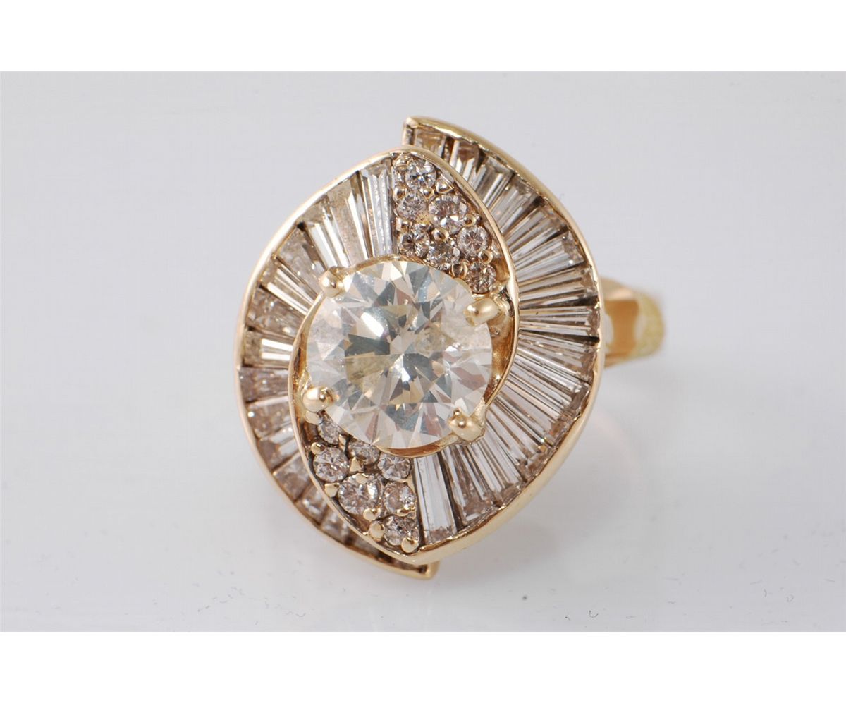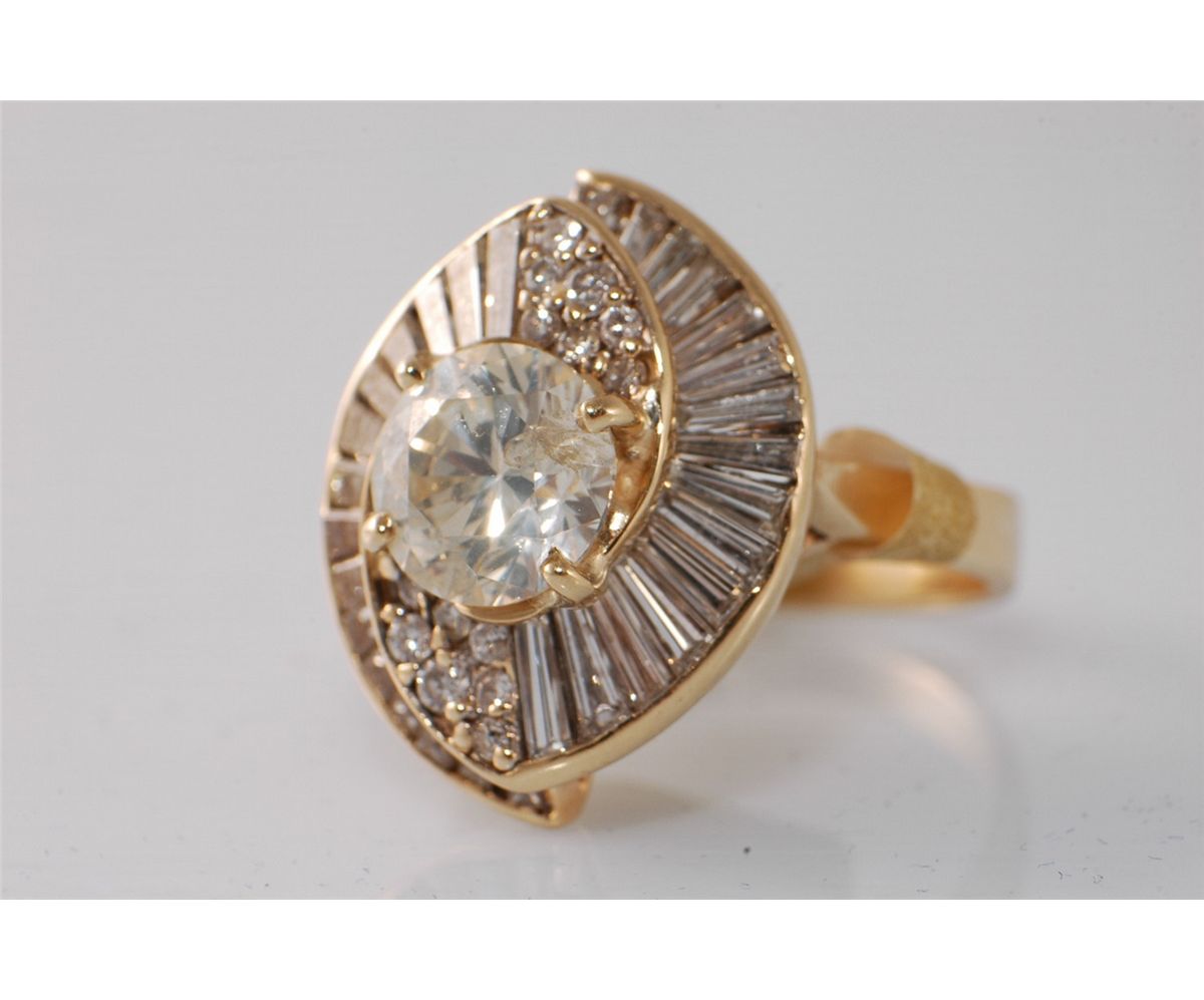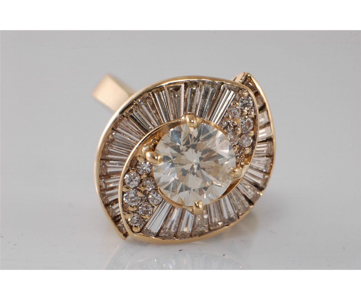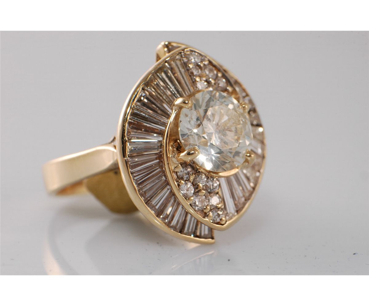 Round brilliant cut center stone surrounded by several round cut diamonds and baquette cut diamonds set in yellow gold, Total weight 7.56 grams.