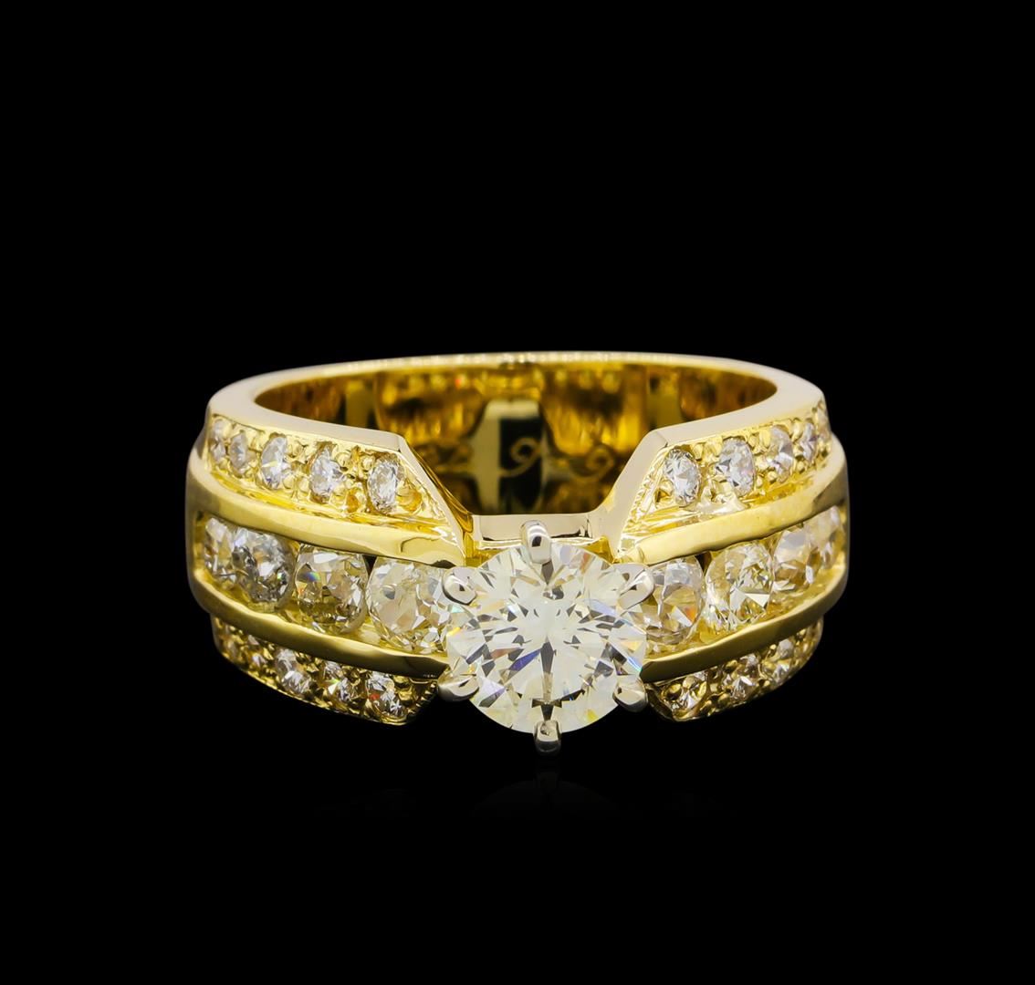 One 18KT yellow gold ring weighing 13.2 grams containing one center diamond with SI1 clarity and G color weighing 1.08ct and adjacent diamonds with SI1-SI2 clarity and G-H color weighing 1.30ctw. GGA Appraised at $16,240.00.