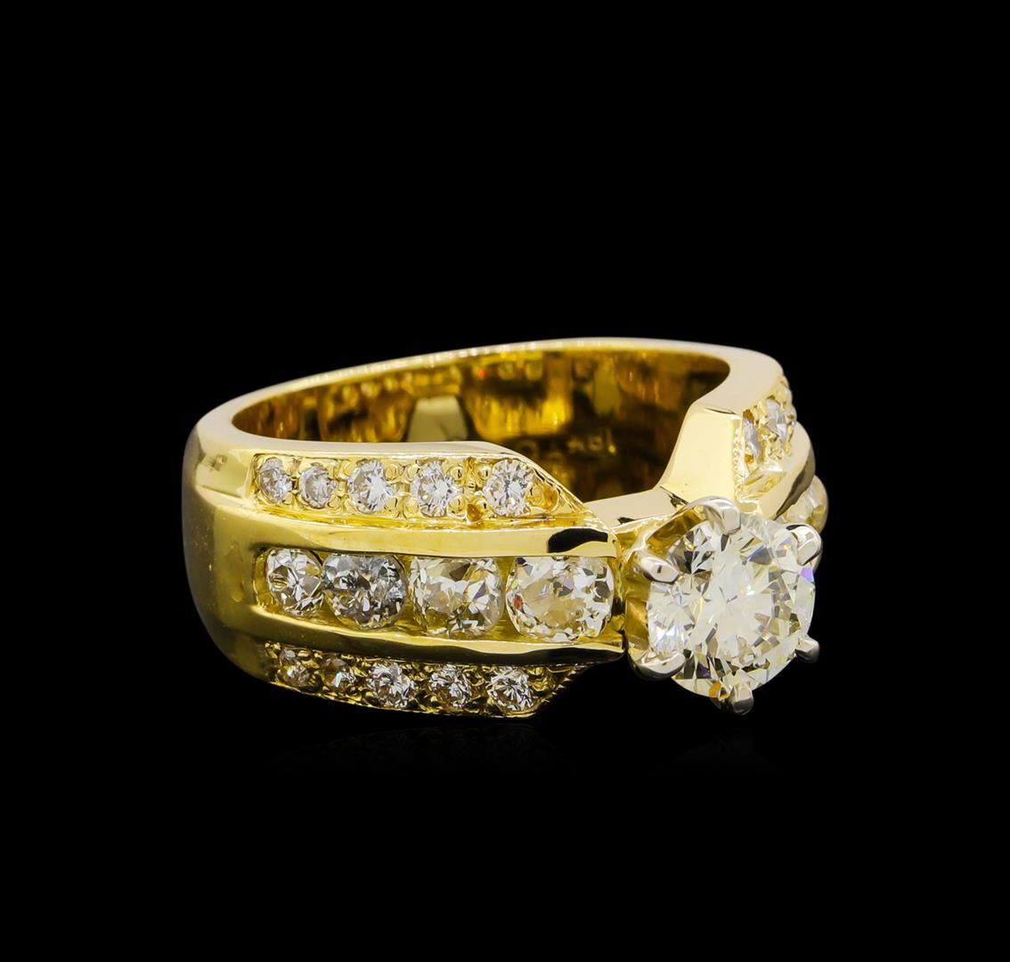 One 18KT yellow gold ring weighing 13.2 grams containing one center diamond with SI1 clarity and G color weighing 1.08ct and adjacent diamonds with SI1-SI2 clarity and G-H color weighing 1.30ctw. GGA Appraised at $16,240.00.
