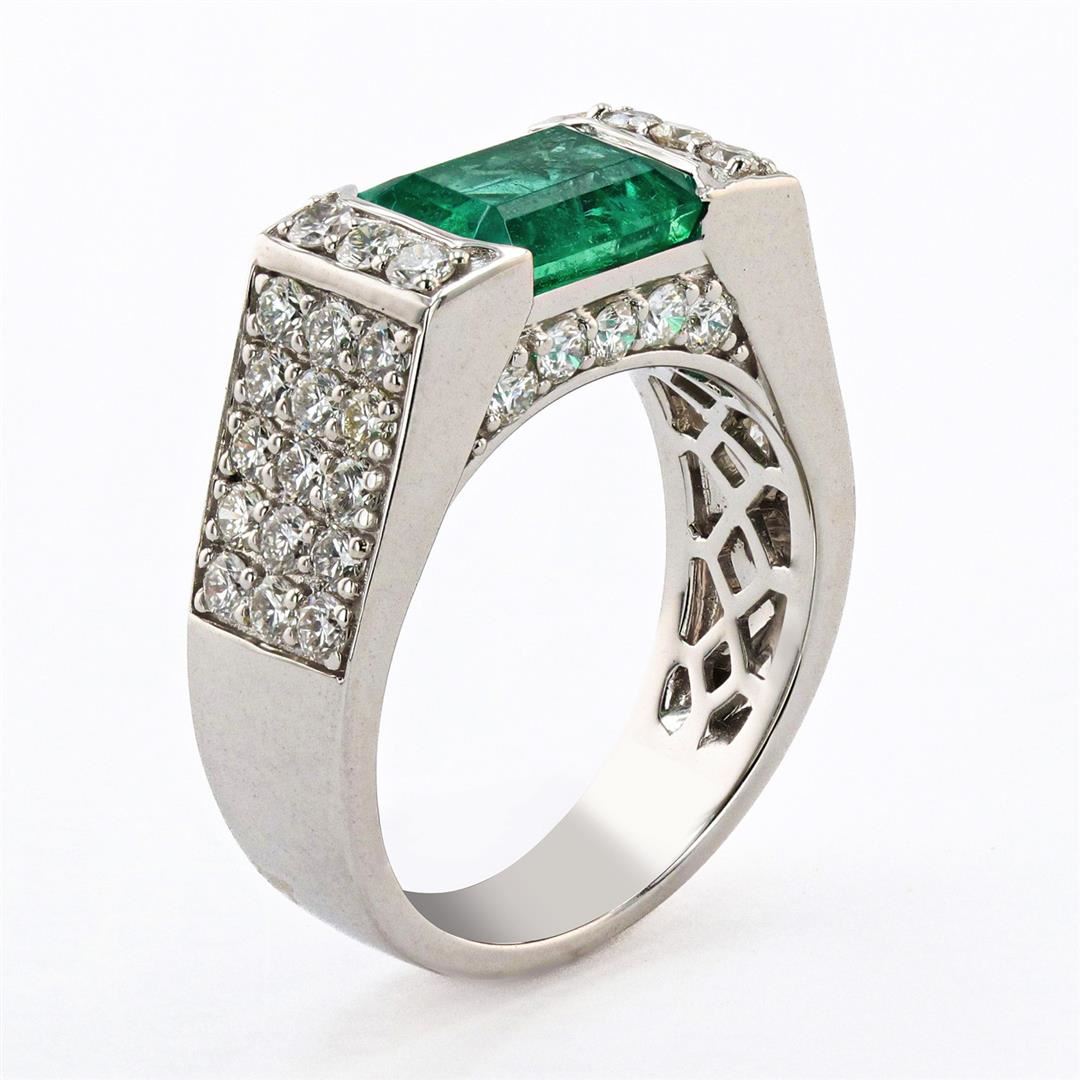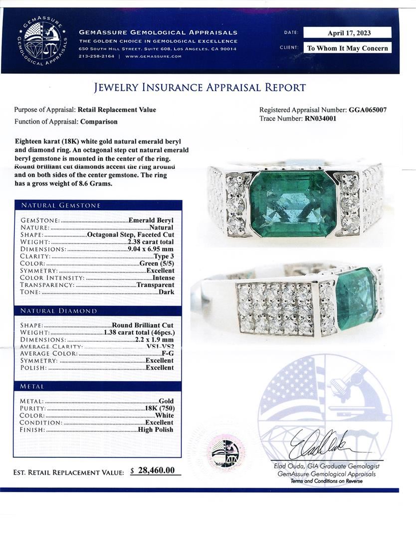 2.38ct Emerald and 1.38ctw Diamond 18K White Gold Ring. Eighteen karat (18K) white gold natural emerald beryl and diamond ring. An octagonal step cut natural emerald beryl gemstone is mounted in the center of the ring. Round brilliant cut diamonds accent tile ring around and on both sides of the center gemstone. The ring has a gross weight of 8.6 Grams. NATURAL GEMSTONE GEMSTONE: Emerald Beryl NATURE: Natural SHAPE: Octagonal Step, Faceted Cut WEIGHT: 2.38 carat total DIMENSIONS: 9.04 x 6.95mm CLARITY: Type 3 COLOR: Green (5/5) SYMMETRY: Excellent COLOR INTENSITY: Intense TRANSPARENCY: Transparent TONE: Dark NATURAL DIAMOND SHAPE: Round Brilliant Cut WEIGHT: 1.38 carat total (46pcs.) DIMENSIONS: 2.2 x 1.9mm AVERAGE CLARITY: VS1-VS2 AVERAGE COLOR: F-G SYMMETRY: Excellent POLISH: Excellent METAL METAL: Gold PURITY: 18K (750) COLOR: White CONDITION: Excellent FINISH: High Polish