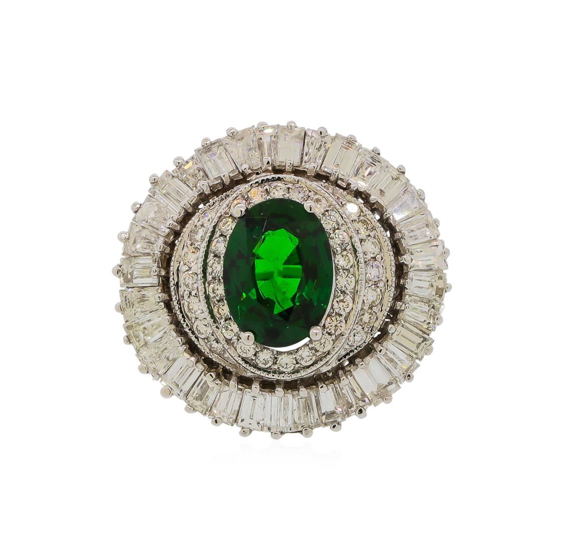 One electronically tested 14KT white gold lady's cast fashion ring with a double basket halo with a bright polish with milgrain detailing finish. The featured lady's ring has a shank measuring 1.60 millimeters wide. Identified with markings of '14K'. Condition is new, good workmanship. Containing: One prong set oval modified brilliant cut natural tsavorite garnet, measuring 10.02 x 7.40 x 4.25mm, (depth est.) approximate weight of 2.38ct., clarity is eye clean, medium dark, moderately strong, green color, (GIA G 6/4), cut is good. Transmitting light with no distortion, transparent. Colored gemstones are presumed to have been subjected to commonly used enhancement processes. Graded in the setting. Thirty-Six prong set round brilliant cut diamonds, measuring 1.60 - 1.50 x 0.96mm (depth est.) approximate total weight of 36 Stones = 0.51ct. Graded in the setting. Clarity SI-1 to SI-2. Color: H - I Cut Good Thirty-Two prong set baguette cut (tapered) diamonds, measuring from 2.80 x 1.60 x 1.36mm (depth est.) to 3.40 x 1.70 x 1.45mm (depth est.) approximate total weight of 32 Stones = 2.06ct. Graded in the setting. Clarity SI-1 to SI-2. Color: H - I Cut Good. Total Weight of Colored Stones 2.38ct.. Total Weight of Diamonds 2.57ct.. Total Weight of Ring 7.60gm. GAS Appraised at $17,660.00.