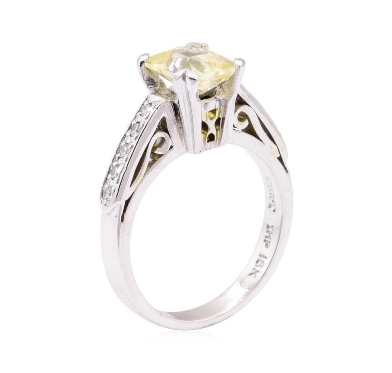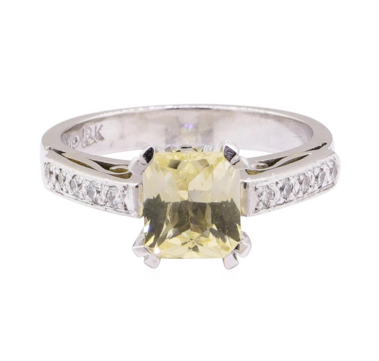 One ring featuring: 18KT yellow gold and platinum weighing 9.3 grams containing one yellow sapphire weighing 2.08ct and diamonds weighing 0.30ctw. The ring has a straight line cathedral motif.